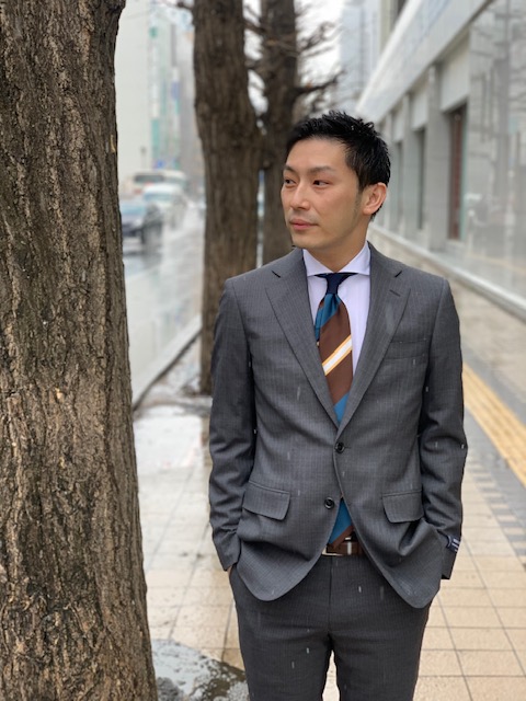 まずは定番ながら最近復権の、グレースーツ。