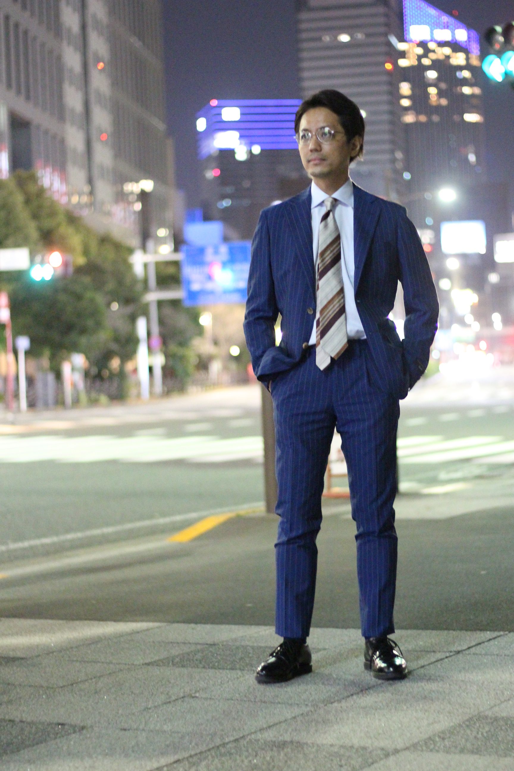 くすみのあるブルー×イエローのネクタイで親しみやすいポジティブな雰囲気に。