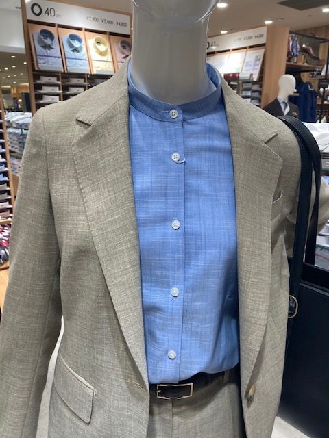 軽く羽織れるノーカラーのセットアップ。