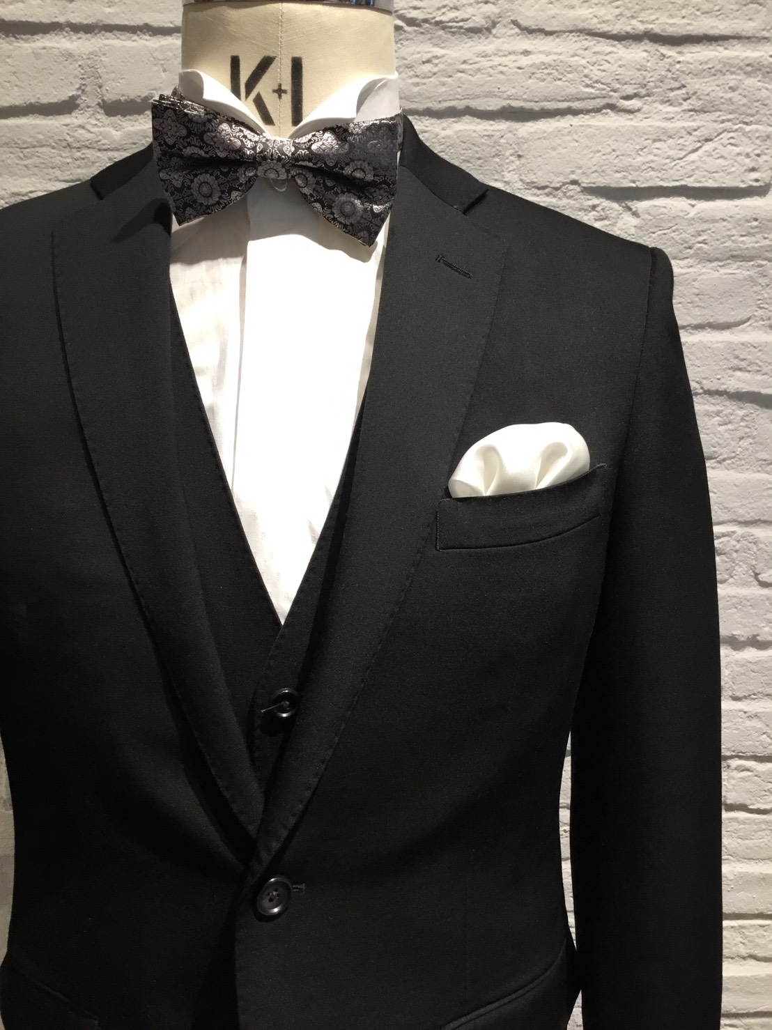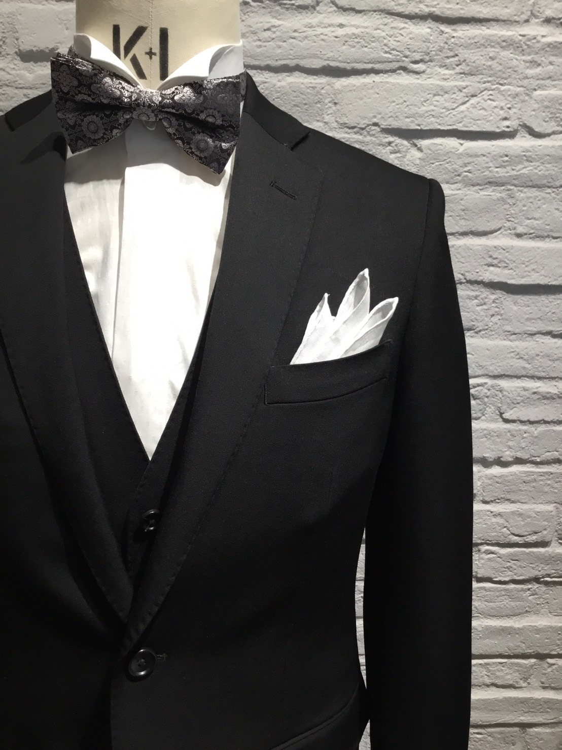 黒のフォーマルスタイルの装いには白チーフが鉄則です。