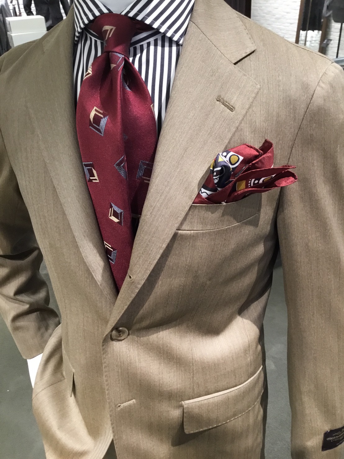 ネクタイやスーツの色を拾う事により、柄を重ねても統一感を出せます。