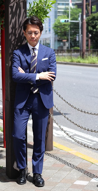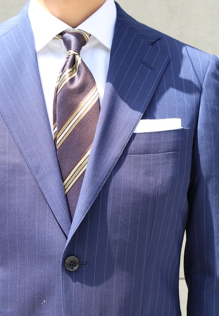 明るめのブルーストライプが爽やかな「HOME WASH」スーツ。ブラウン×ピスタチオカラーのネクタイでVゾーンも明るく華やかにスッキリと仕上げました。生地とパンツのベルト部分に伸縮性を持たせ、半永久的に消えないクリースラインを施しました。