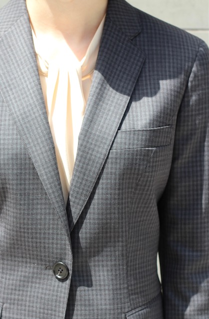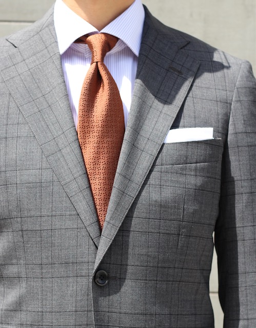 かすれた感じのチェック柄が控えめで大人な装いに。Vゾーンはグレーと相性の良いパープル×オレンジタイで温かみのある印象に仕上げました。今期の「HOME WASH」スーツは、裏地や膝当てもメッシュ仕様で春夏の暑い時期でも快適に着用できます。