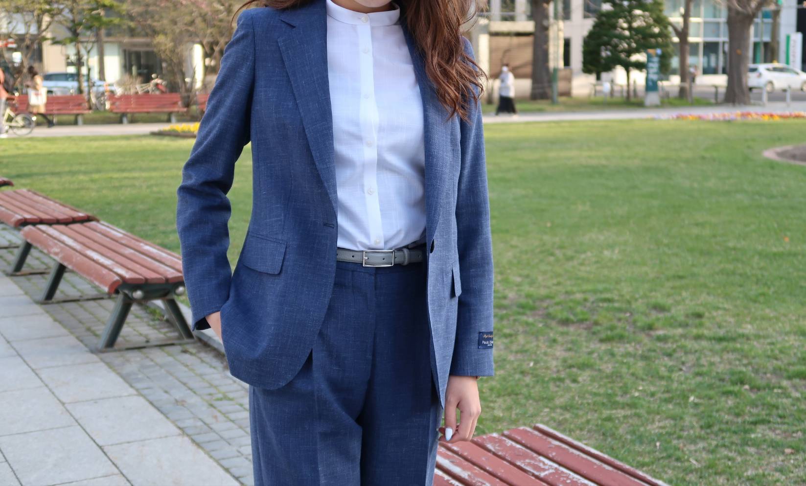 着丈は従来のジャケットよりも長く仕立て、ウエストの絞りは緩やかにトレンドを意識した現代的なシルエット。