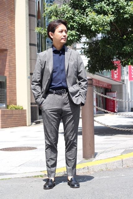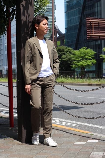 ラグジュアリーブランドでも使用されるストレッチ性、撥水性に優れた日本のハイテク生地。ポリエステル特有のギラつき感がまったくなく、汗にも強い肌触りが特長。私のおすすめポイントは、表面のシボ感による仕立て映えの良さです。軽量なので暑い夏に最適なセットアップです!