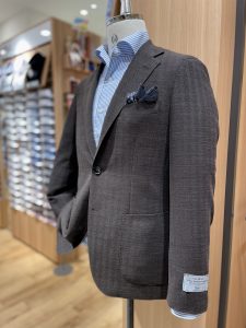 CANONICO社の生地を使用し、深みのある色とクラシックなヘリンボーン柄がヴィンテージ感のあるジャケットに仕上がっております。ストレッチ性もありますので、着心地も抜群です。大人の落ち着いた装いになります。