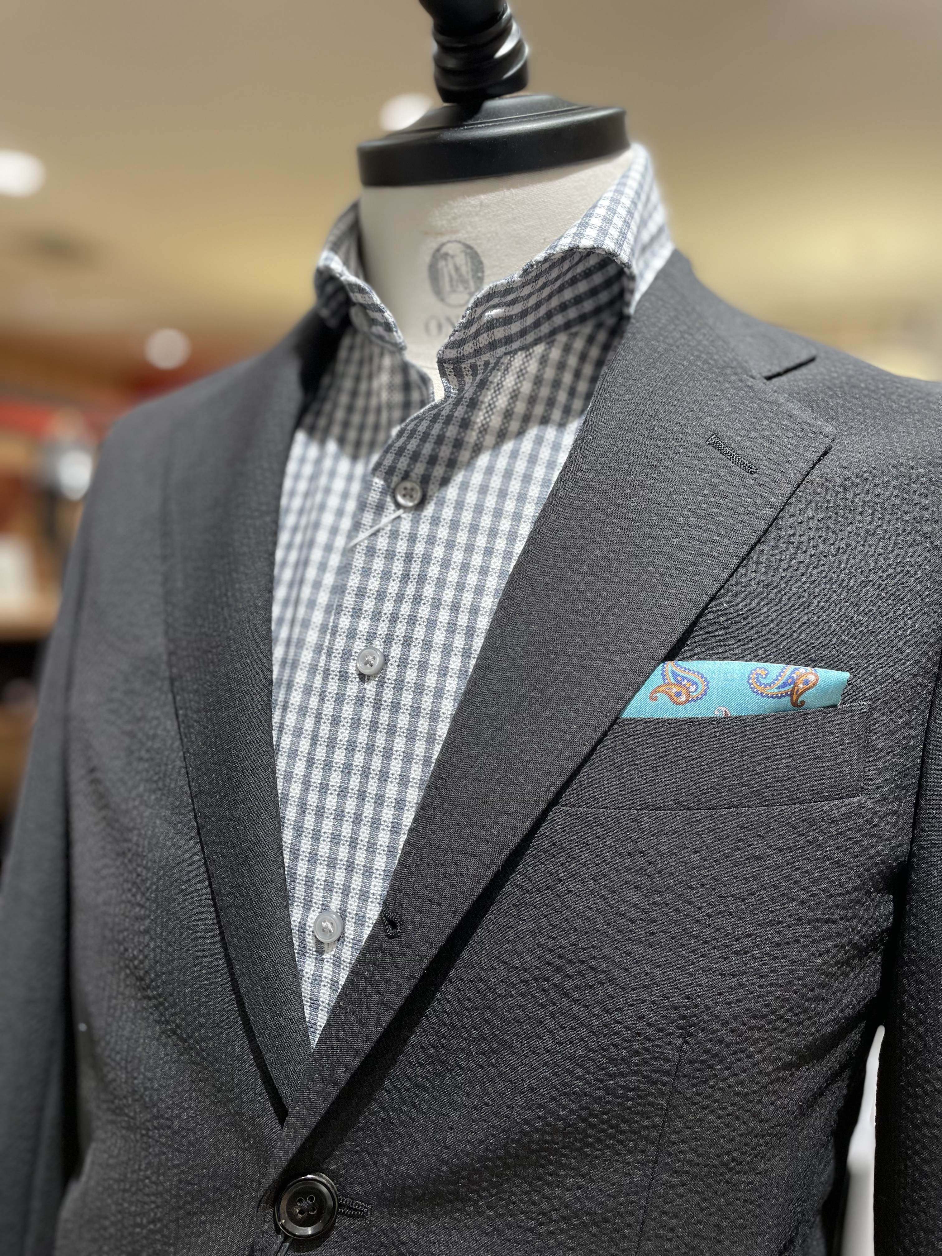 こちらは春夏に最適なウールのシアサッカーを使用したスーツです。スーツには珍しい素材感なので、今持っているスーツとの差別化も出来ると思います。