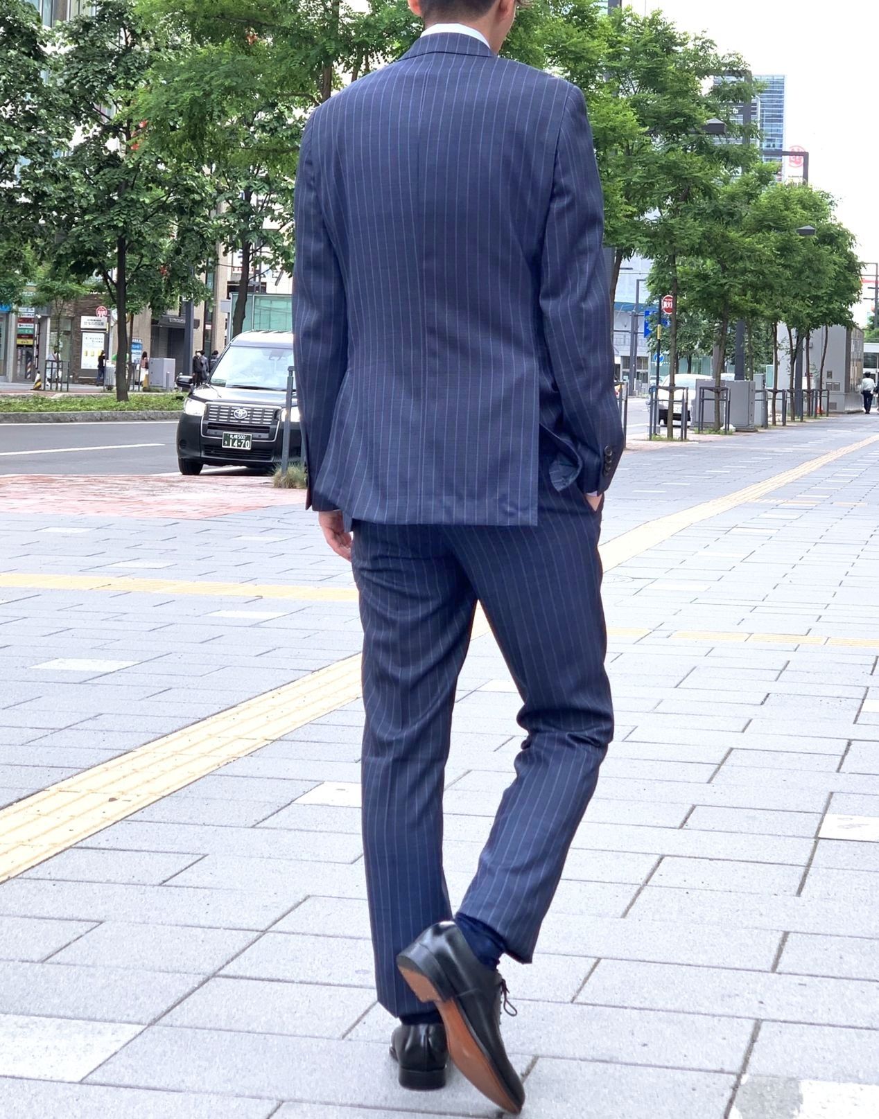 定番のストライプ生地ですが、ほんの少しだけデニム生地のような雰囲気も持っているスーツになります!