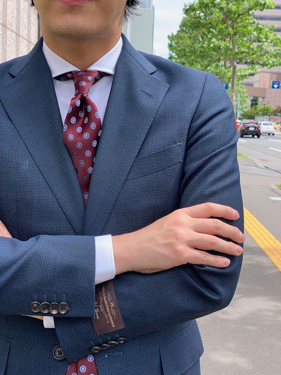 一見無地のように見えるハウンドトゥースのネイビースーツです!