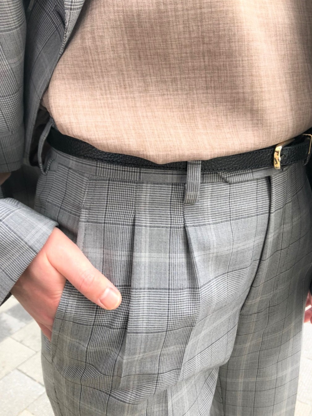 襟元はピークドラペル、パンツはハイウエストですっきりシルエットなので、カッコよさが引き立ちます(^^)
