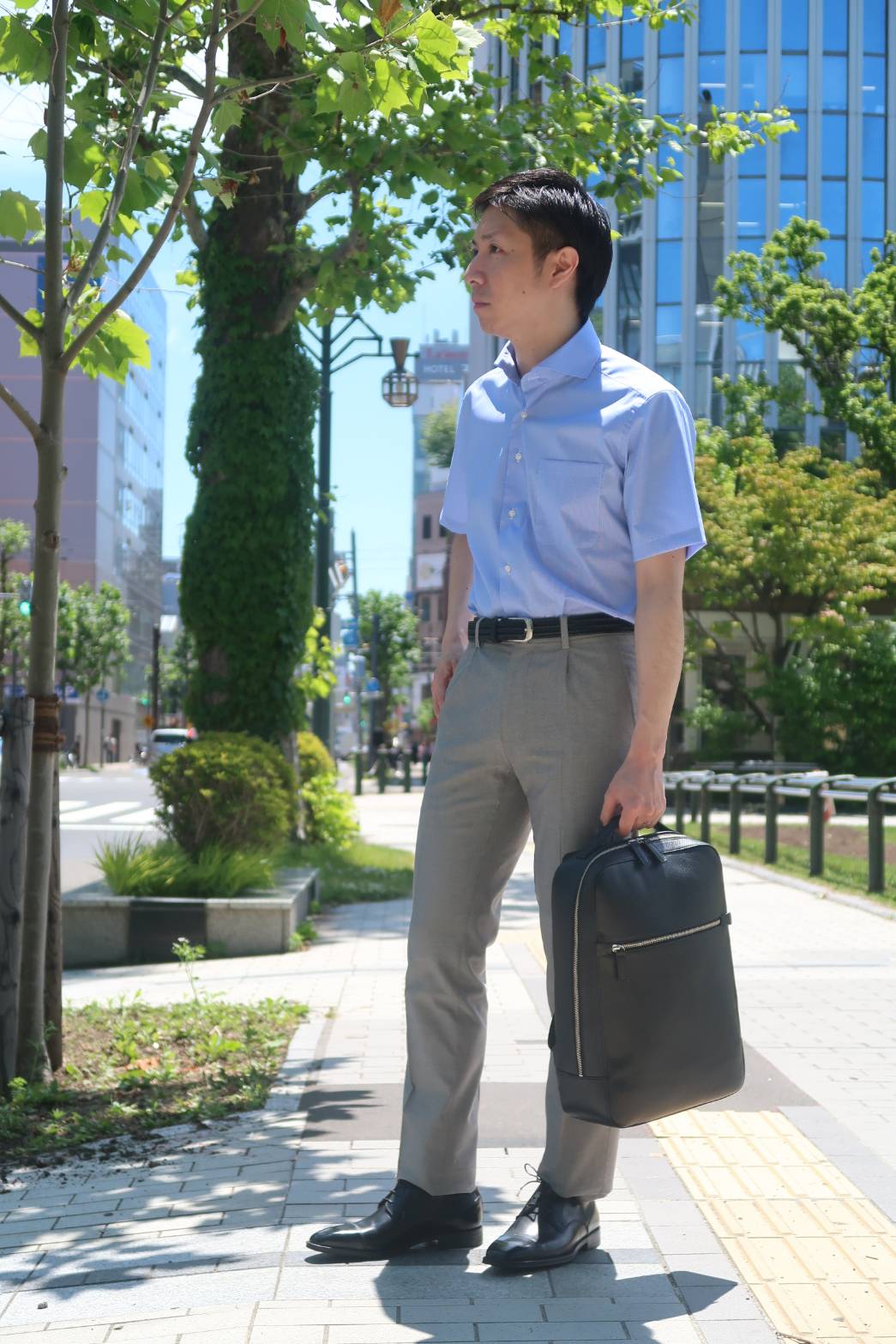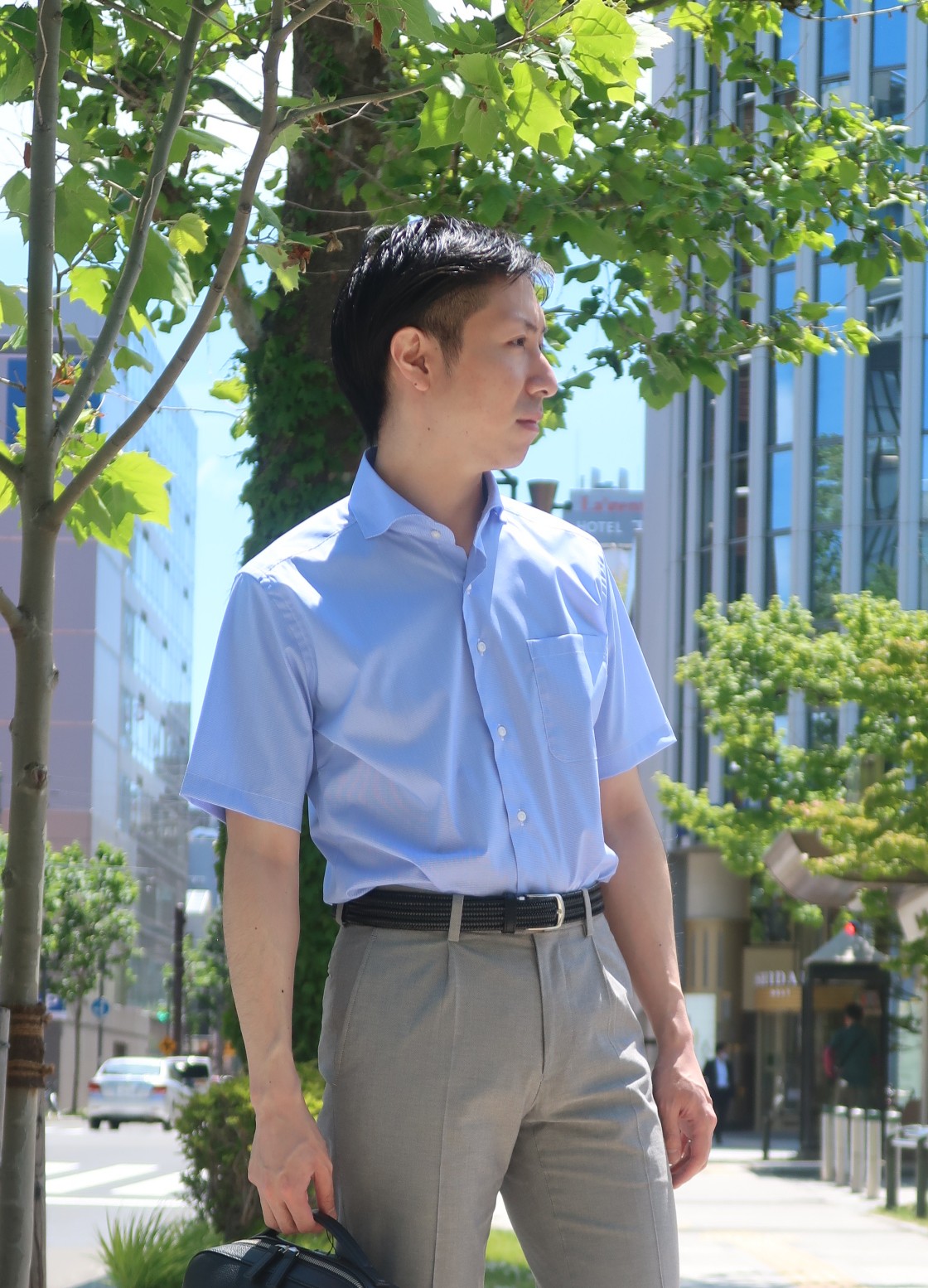 爽やかなサックスブルーのシャツはCOOL MAX(接触冷感)のため