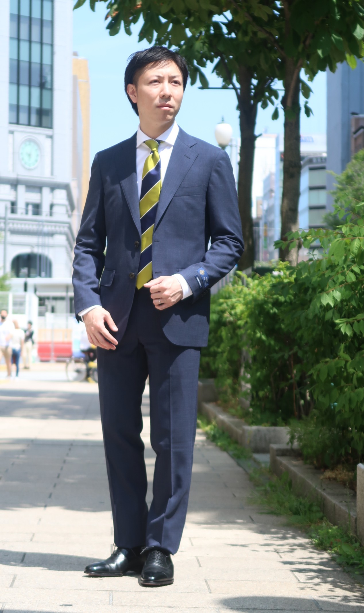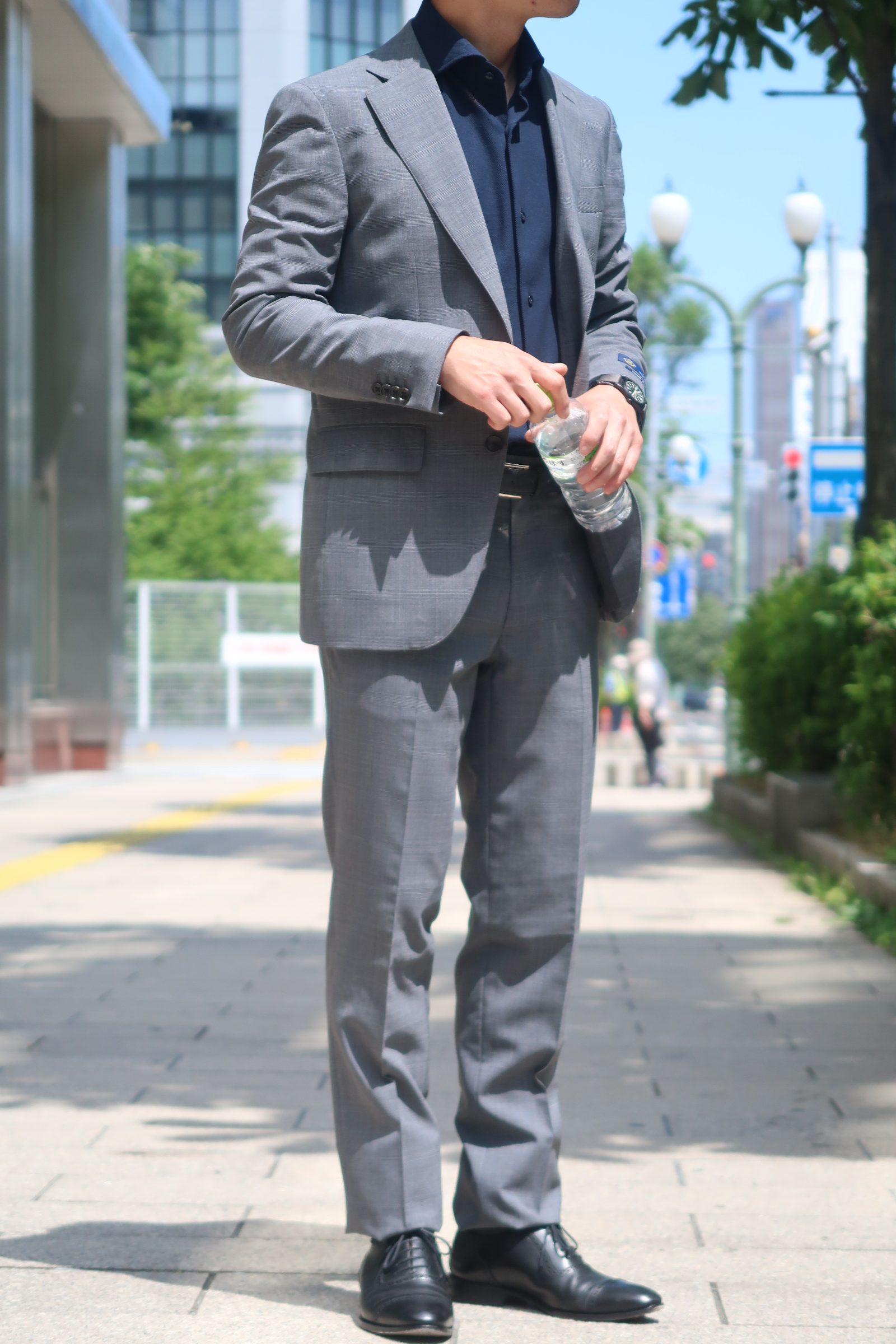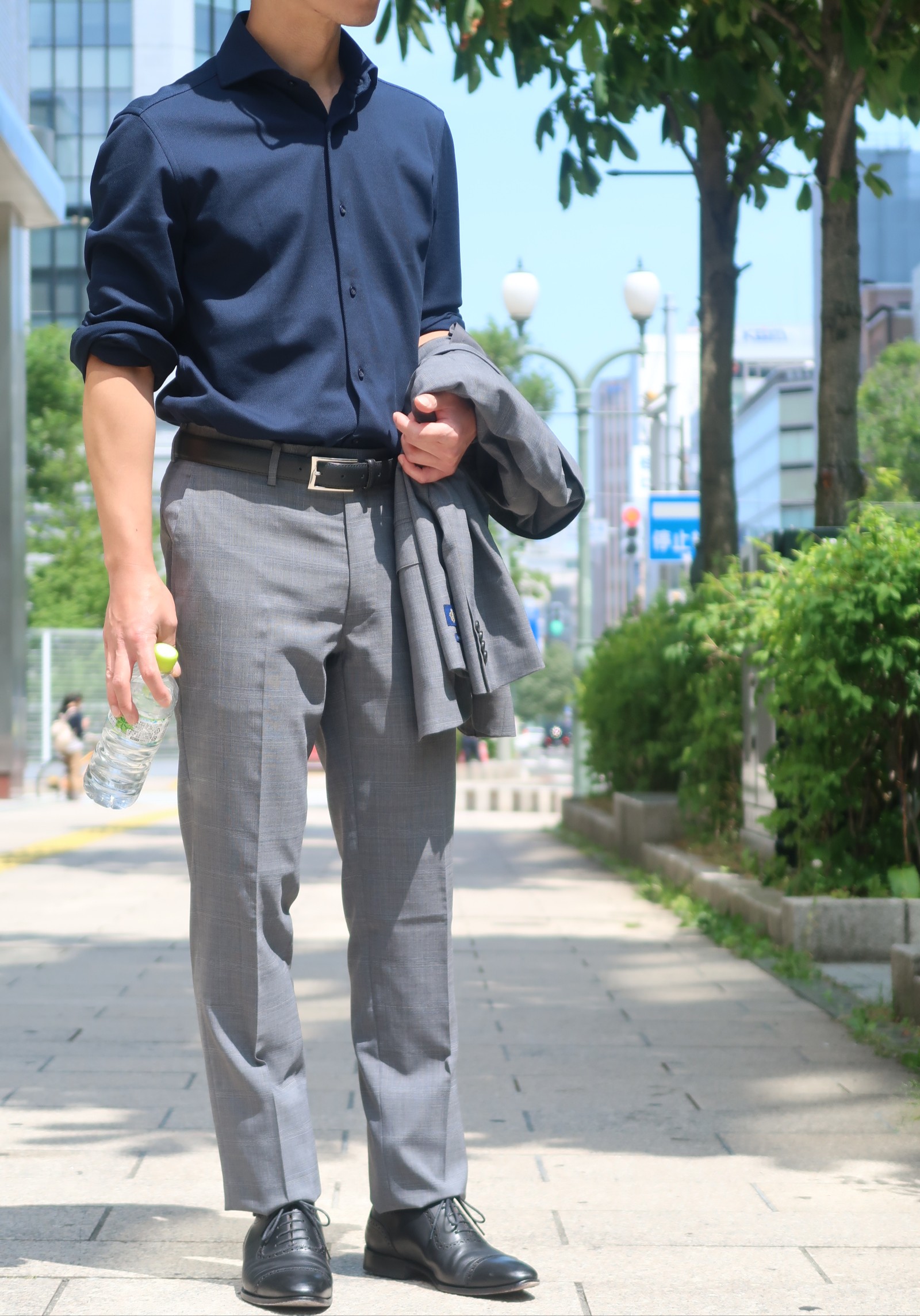 今回はノーネクタイを想定してグレーが映えるネイビーシャツをチョイス、色の濃淡のバランスがよく、