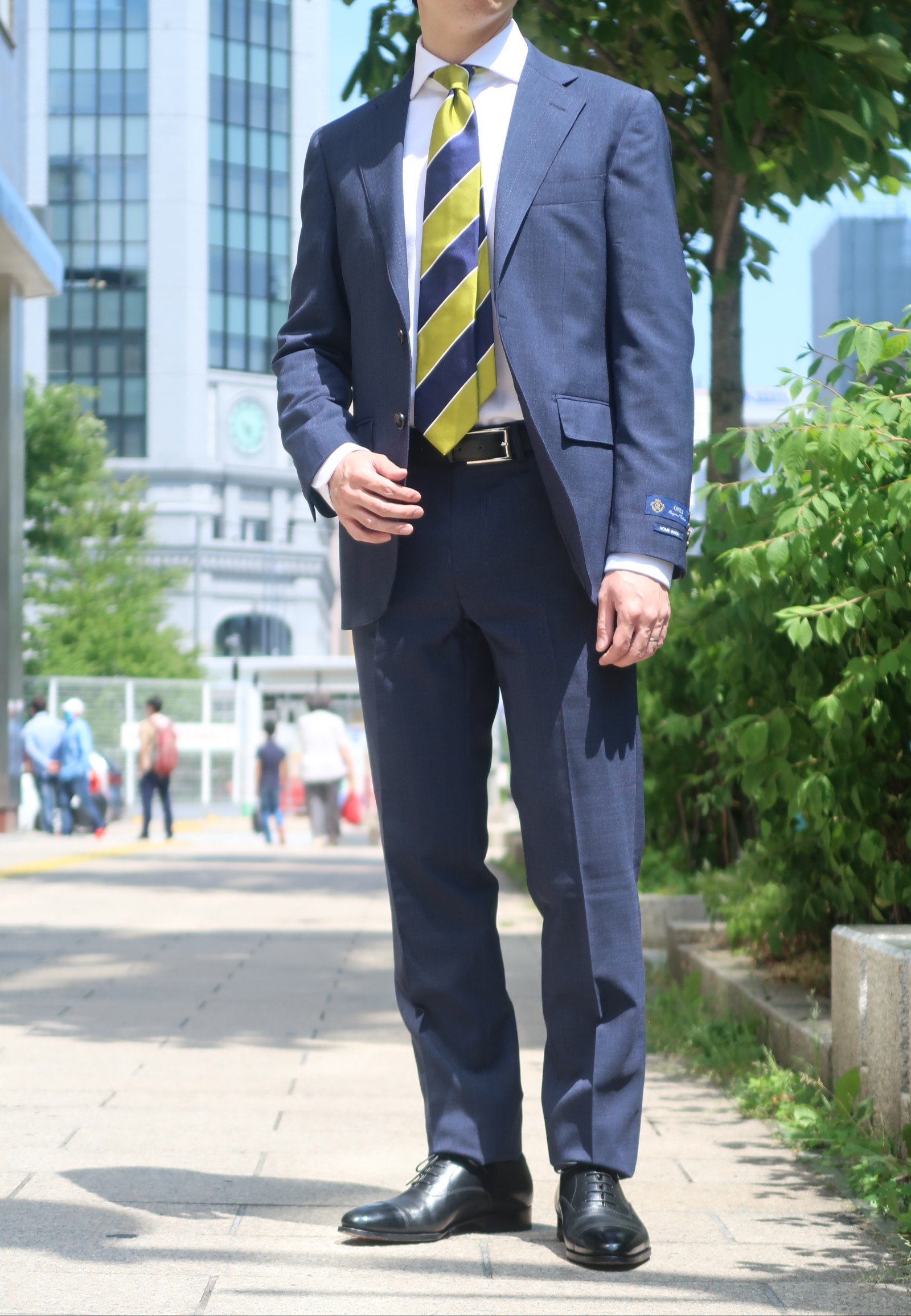 Vゾーンは夏らしく爽やかに白シャツと鮮やかなレジメンタルタイでコーディネート✨