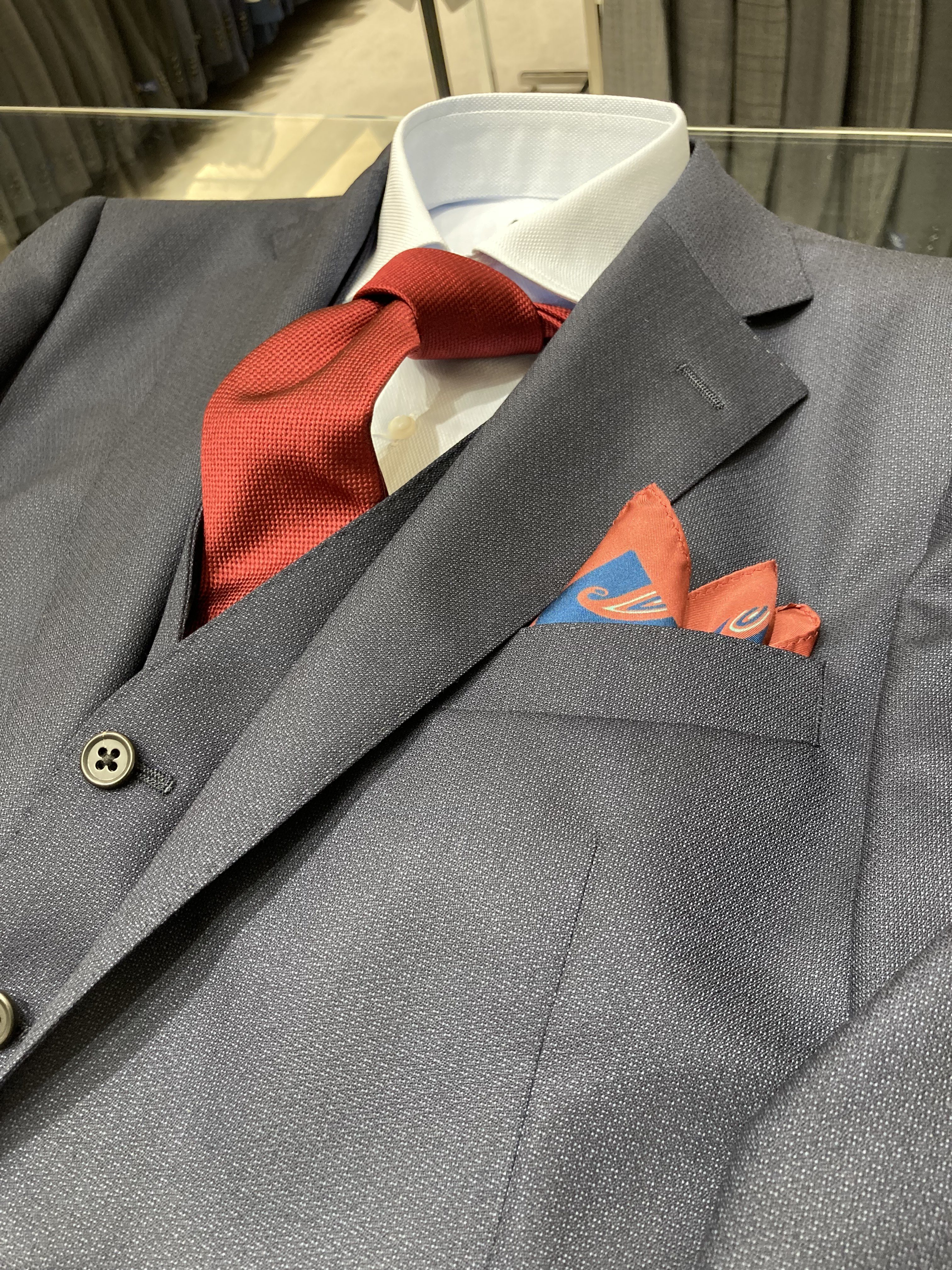 こちらは上下のスーツに違う色のベストを組み合わせました。