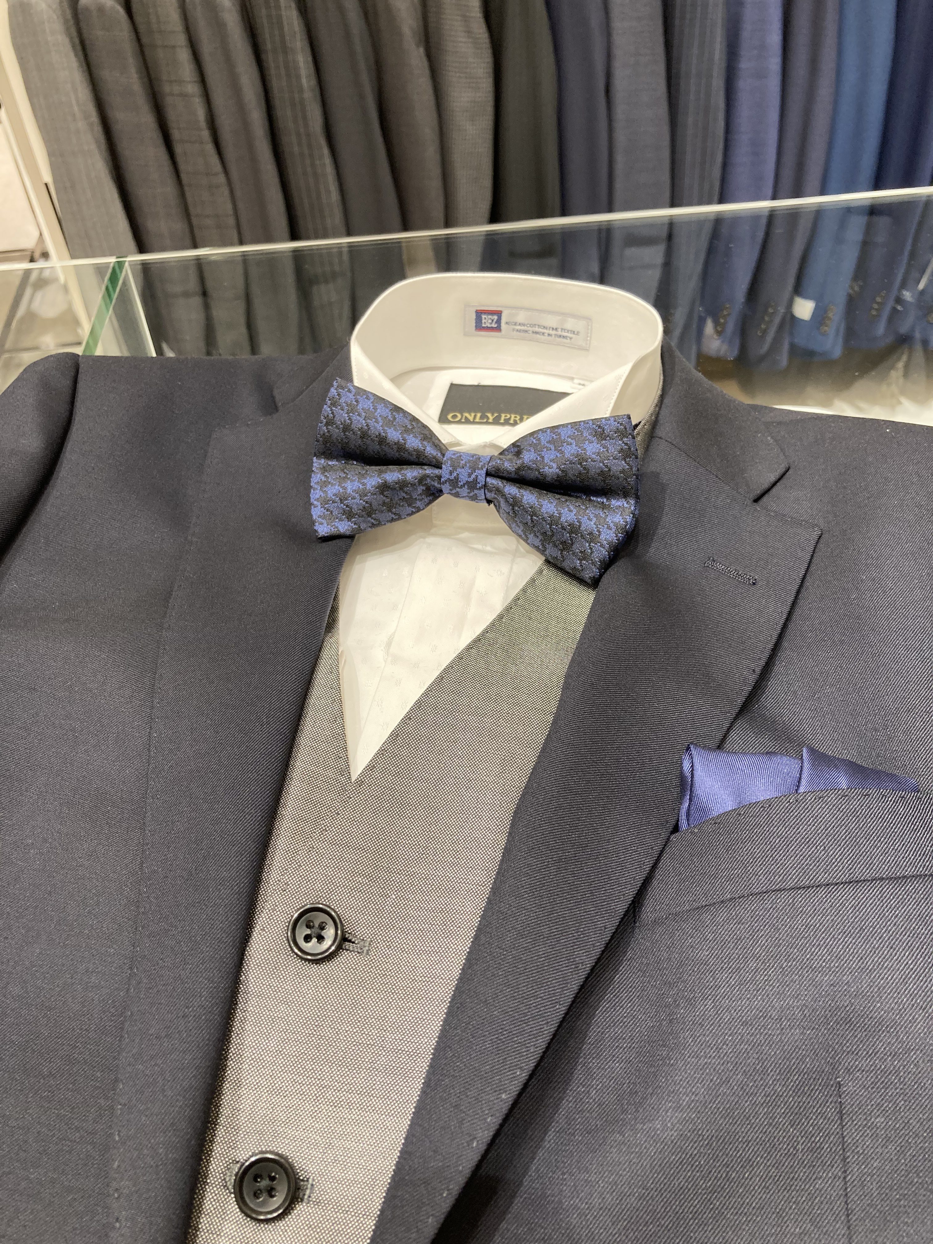 チーフは 蝶ネクタイに合わせブルーをチョイスすることで、まとまりが出て