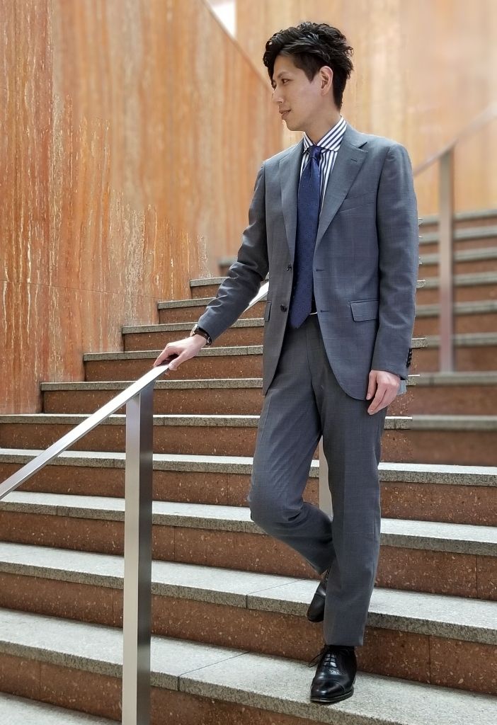 うっすらとブルーのチェックが配されており、清涼感の漂うスーツとなっております!
