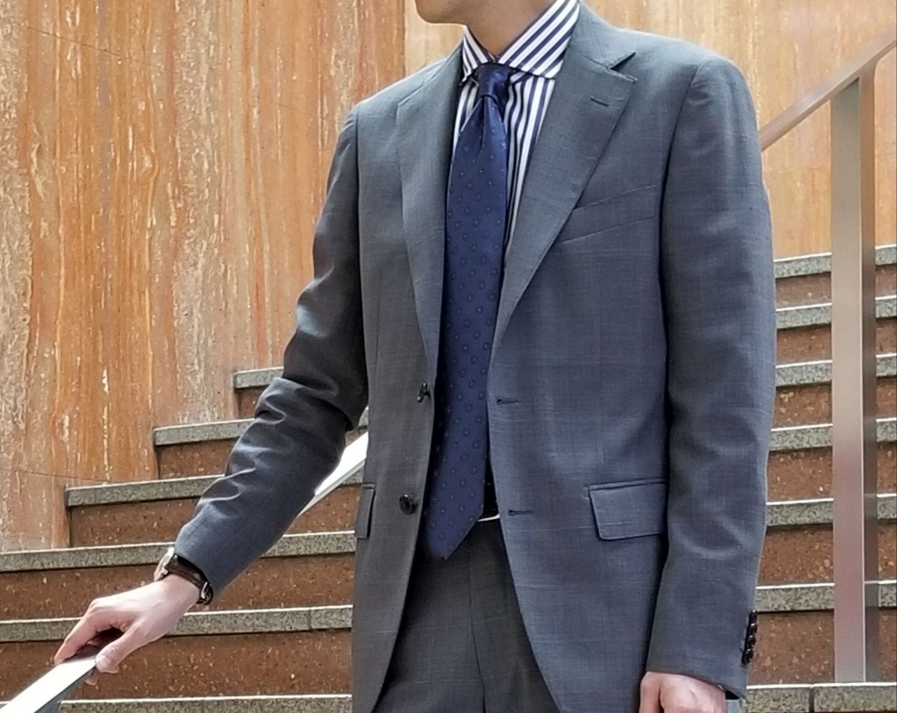 さりげないチェック柄のスーツなのでストライプのシャツを合わせていただいても