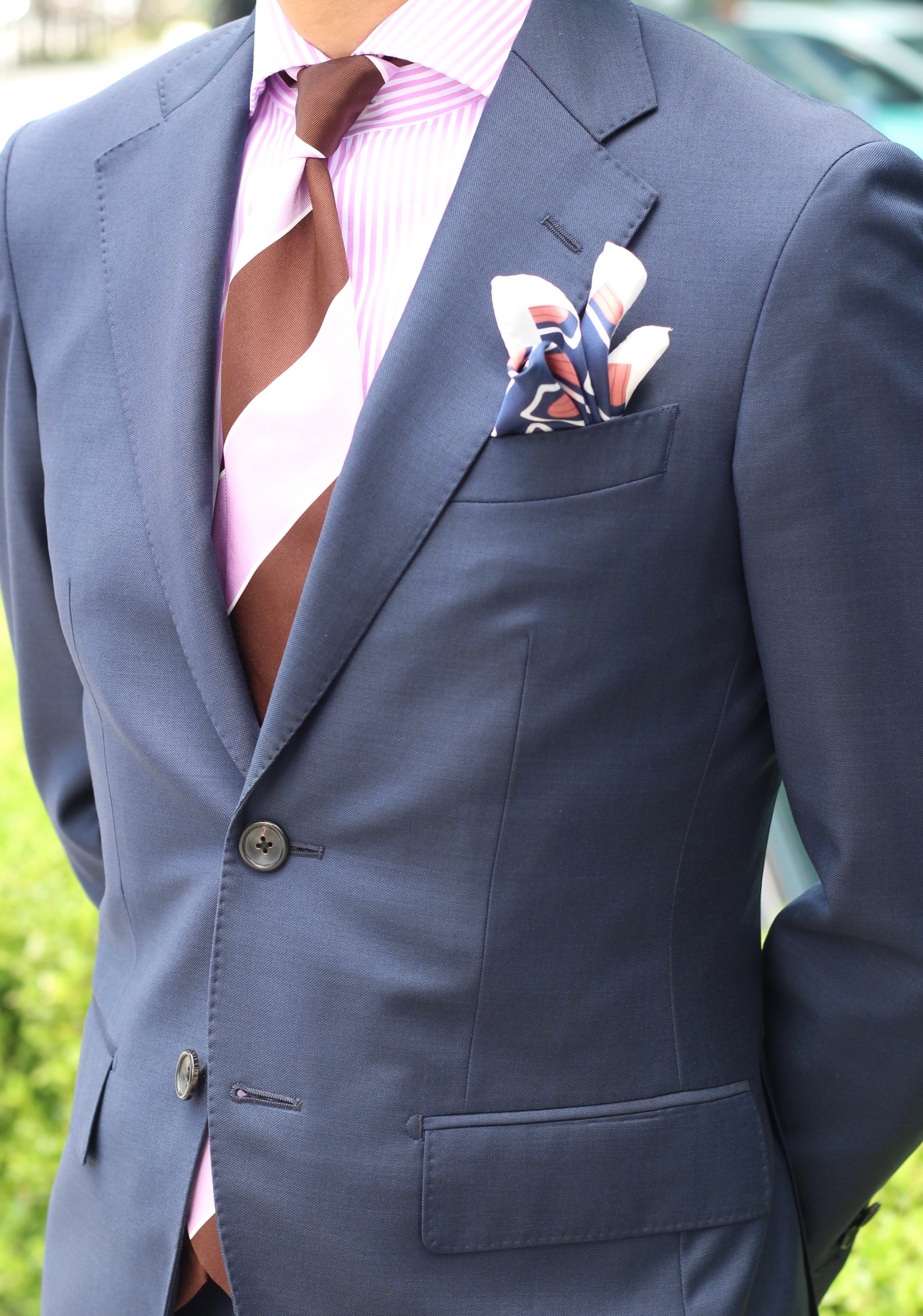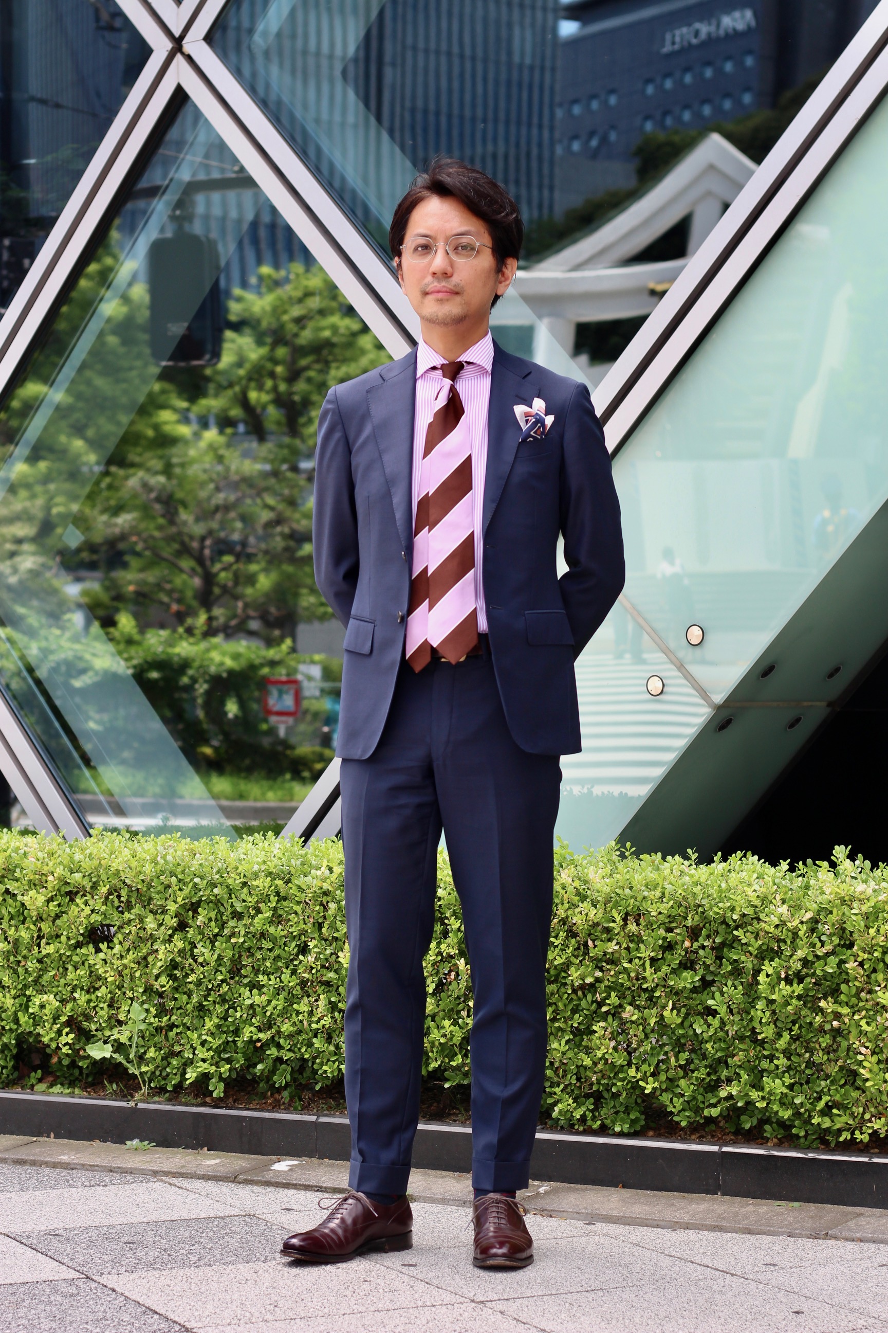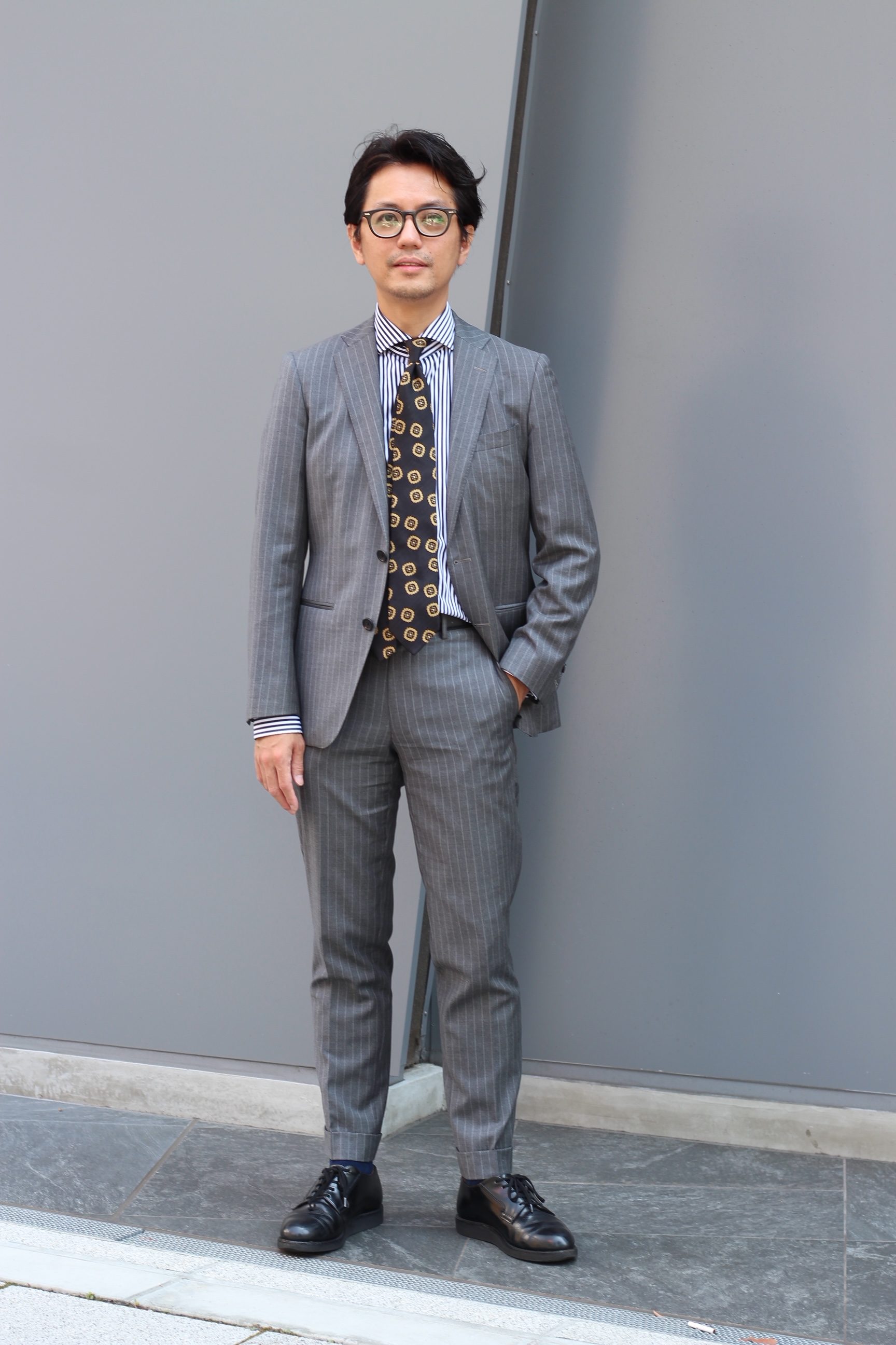黒のロンドンストライプシャツに、不揃いの大柄が印象的なブラックタイを合わせて、少し癖のあるモノトーンスタイルが今の気分です。その他に、白無地シャツにネイビーソリッドタイの王道コーデや、変化球として薄めのブルーシャツに、くすんだカーキ色のネクタイをあわせるなど、その時の気分に応じて変化を楽しめるスーツではないでしょうか。