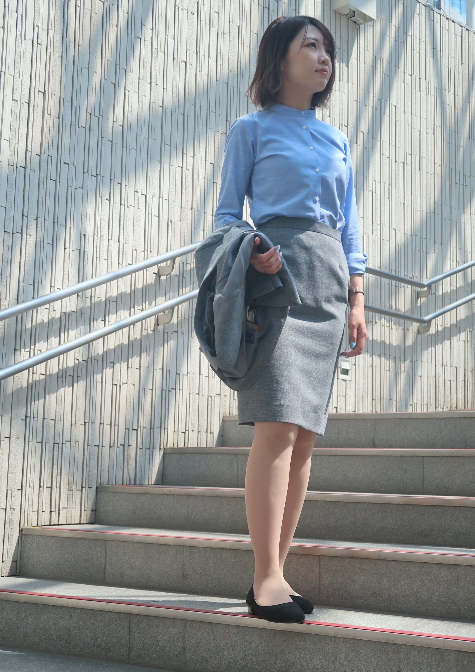 コーディネートは先程のベージュ同様、爽やかさを意識してブルーのシャツで合わせました✨