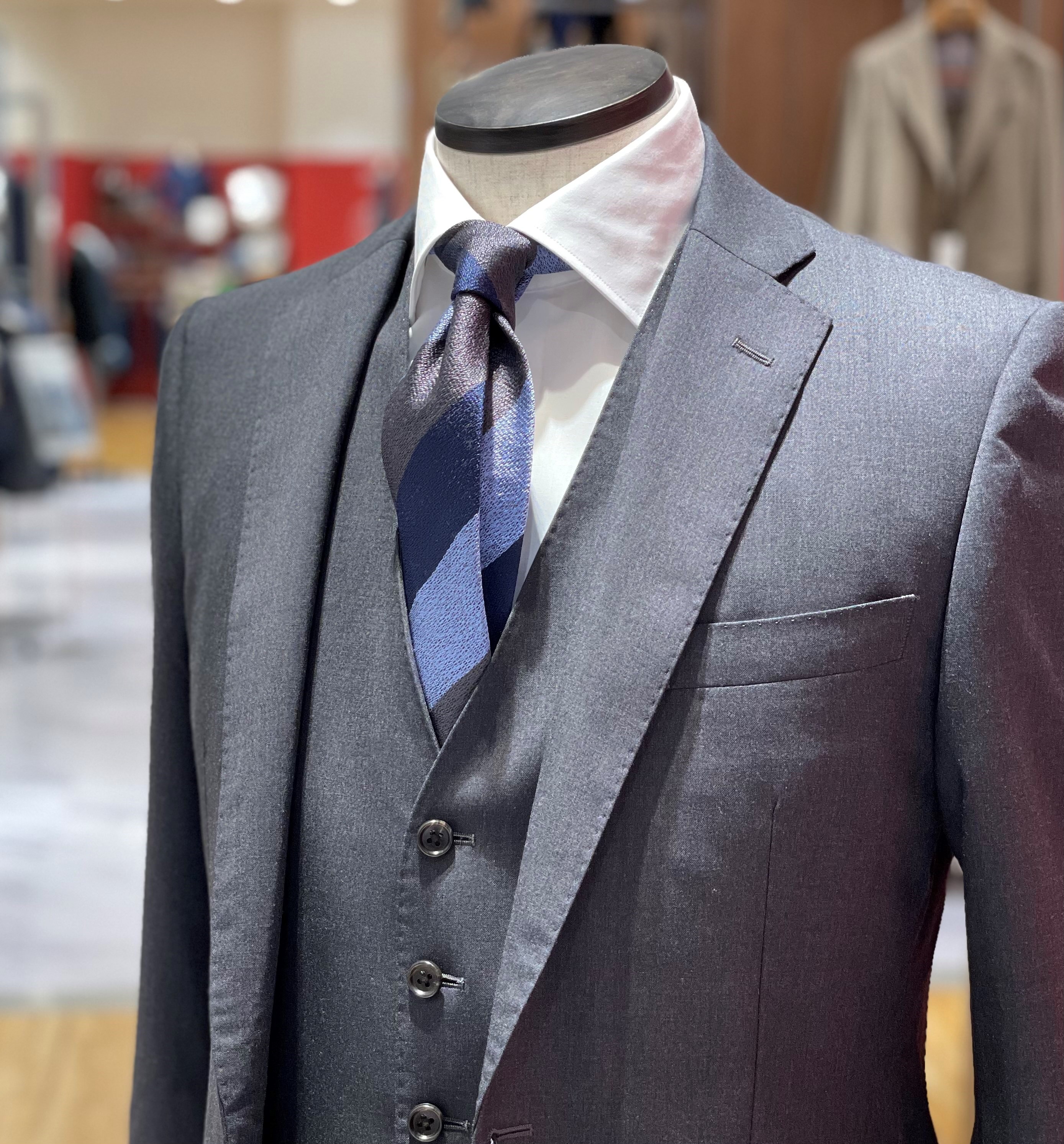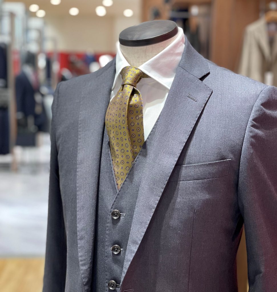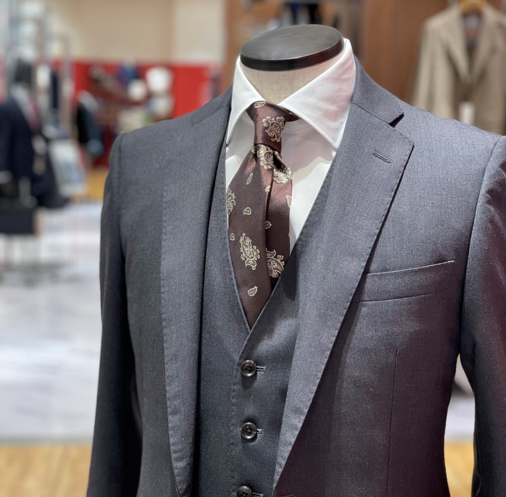 グレーブラウンだと地味になるんじゃないかと懸念されがちですがネクタイにハッキリとした柄があると地味になりにくいです!!