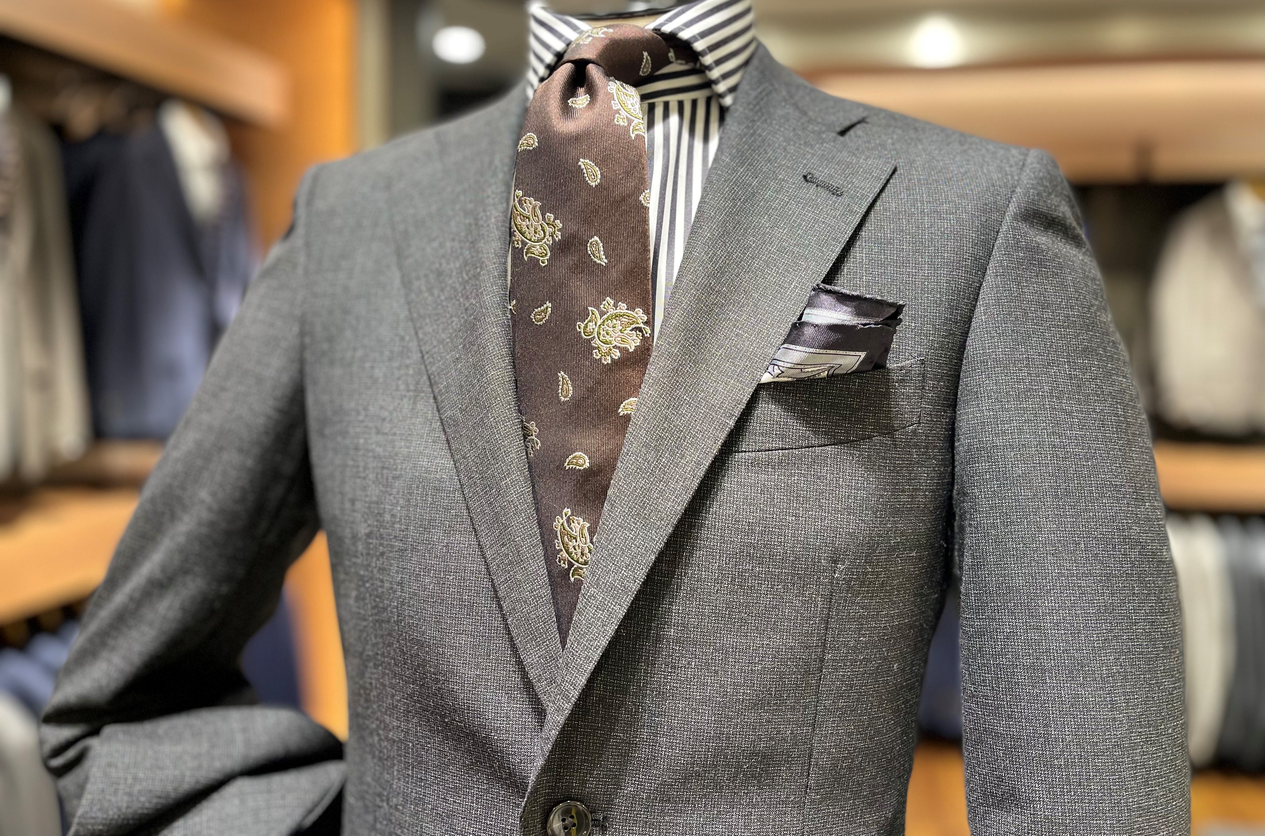 ブラウンのペイズリーのネクタイをポイントにおくことで、