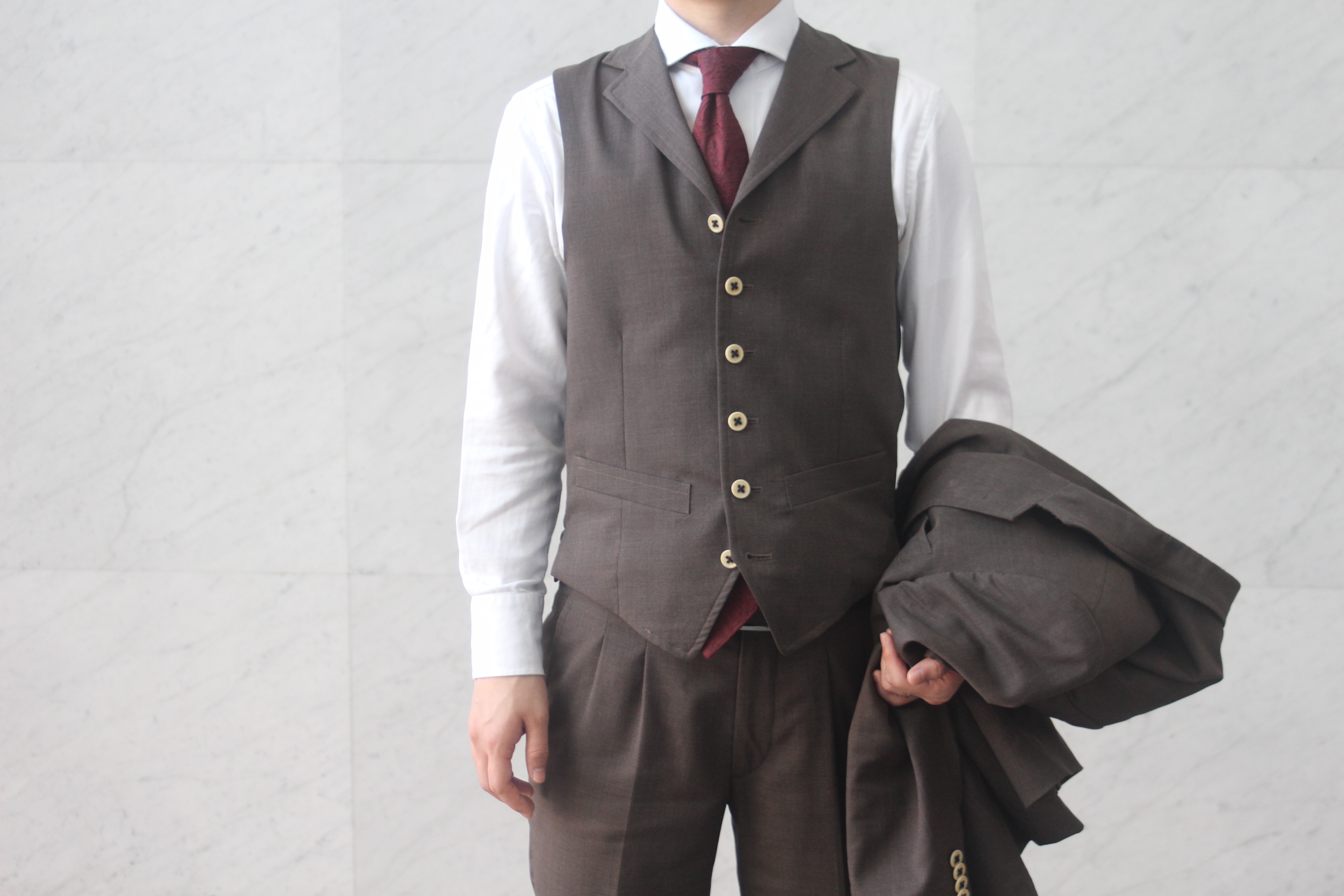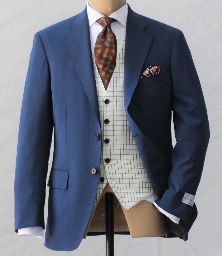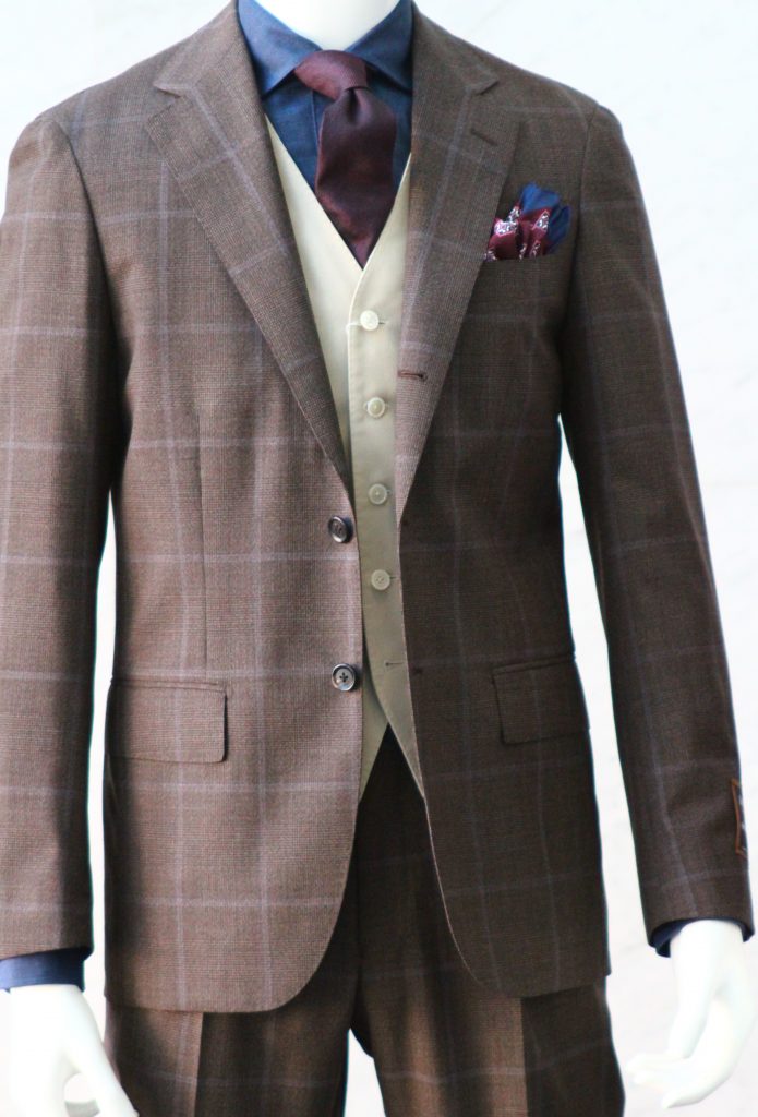 オーダーにしかない襟付きベストを仕立てたりボタン、裏地などももこだわることが出来るので