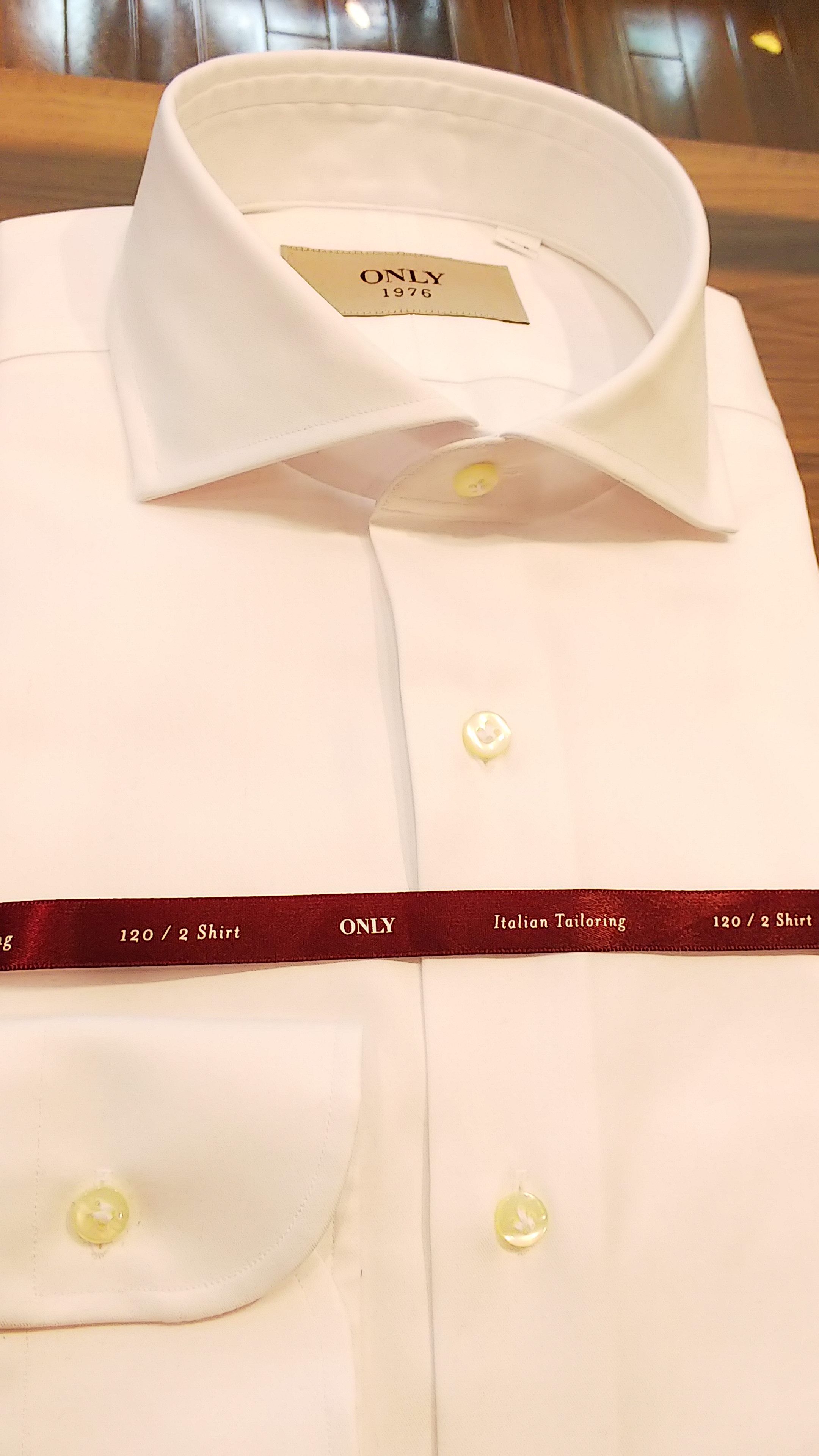 こちらも使い回しを優先しましてフォーマル専用は選ばず、ビジネスでも着用出来て、ほんのり生地に光沢のあるシャツを選びました。