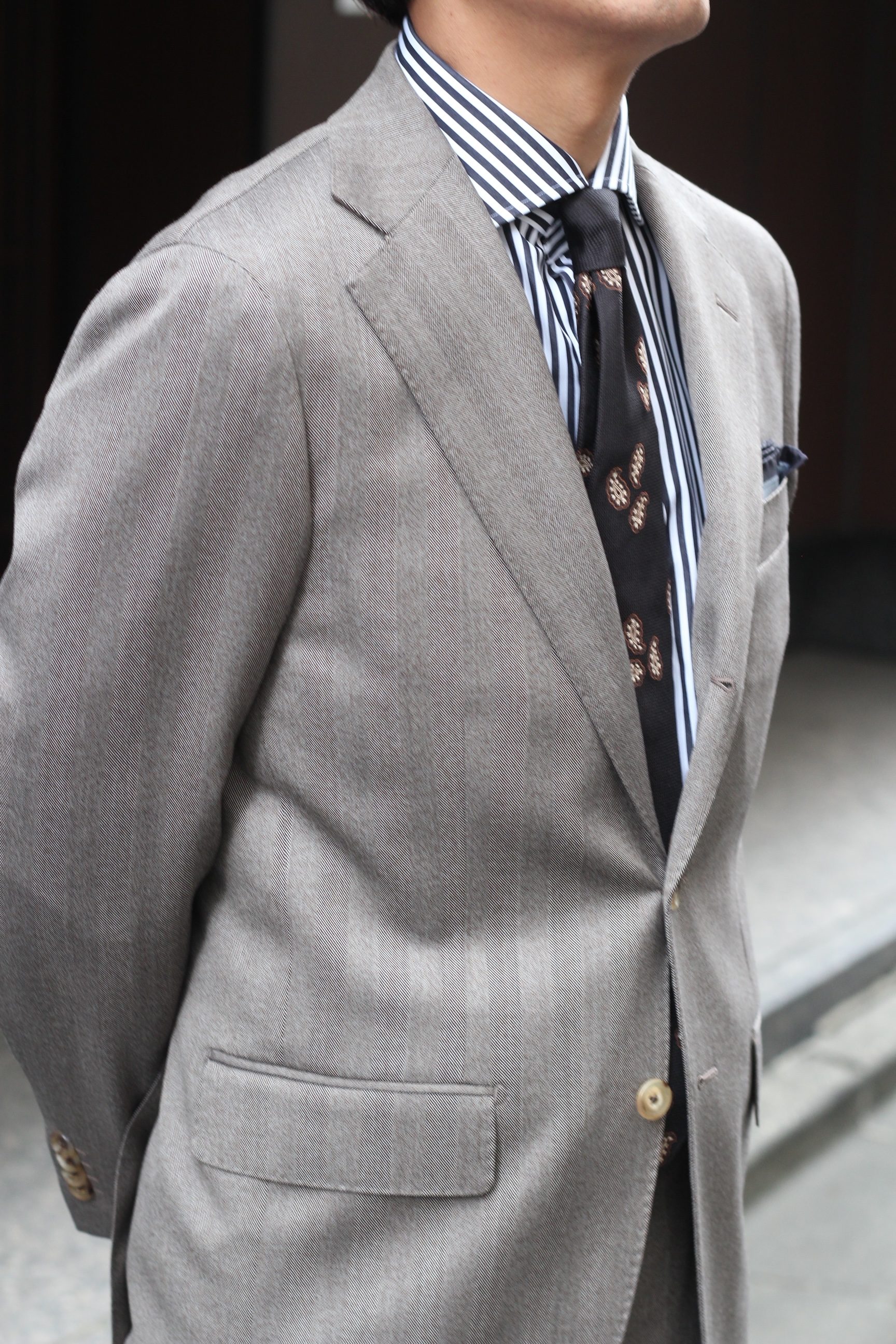 生地ウエイトは、340g/mと肉厚で、どこか無骨さも感じられるクラシックなヘリンボン柄。上質な生地を開発・生産しつづけるイタリアのファブリックメーカーDRAGO社の極細の原毛を使用していることで、見た目とは反して柔らかな仕上げになっています。首から肩にかけての吸い付くような「のぼり」の美しいイタリアンモデルが特長のスーツです。