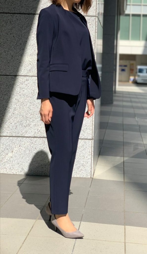 ノーカラーセットアップは女性らしく、