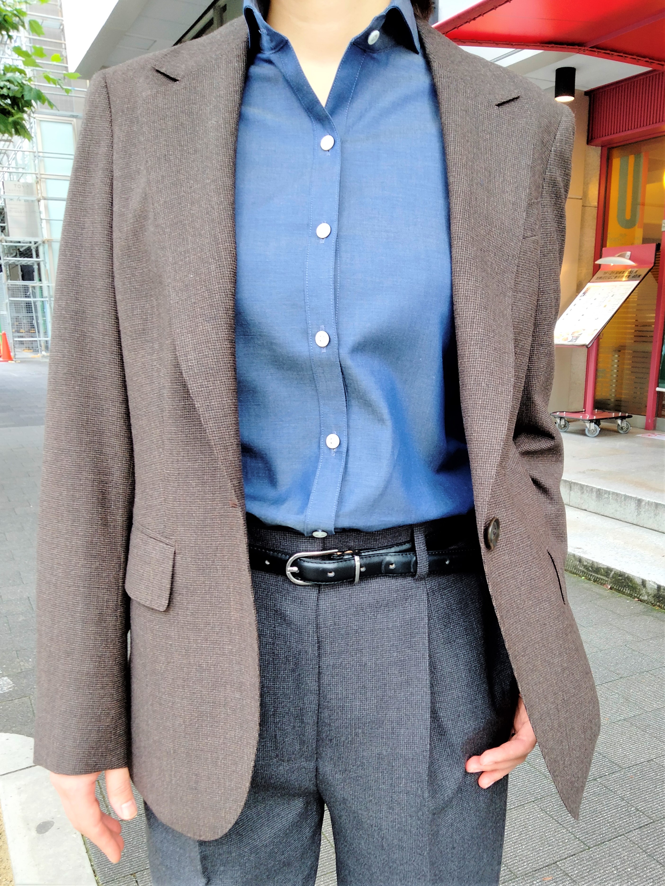↓最後は、ハウンドトゥース柄ブラウンのジャケットと色違いのグレーのパンツを組み合わせてみました♪