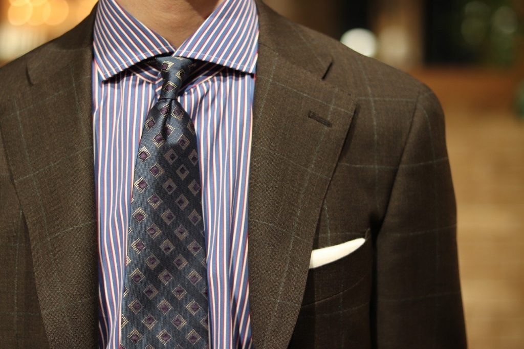 シャツ、スーツでのアズーロ・エ・マローネという青×茶の組み合わせは、イタリア人が好んで使用する配色。