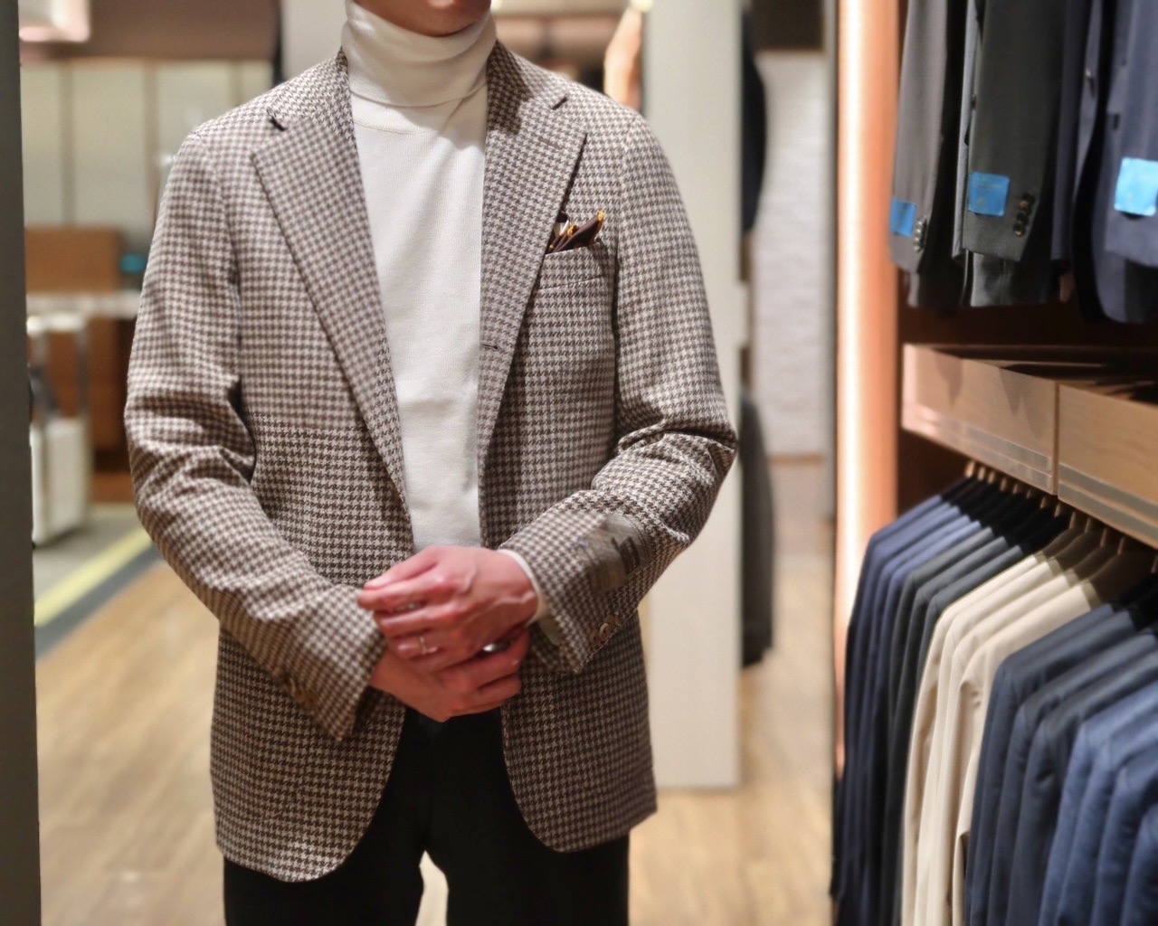 大柄の千鳥格子は無染色ウールの『CANONICO:HOPE』を使用し、天然素材ならではの柔らかな
