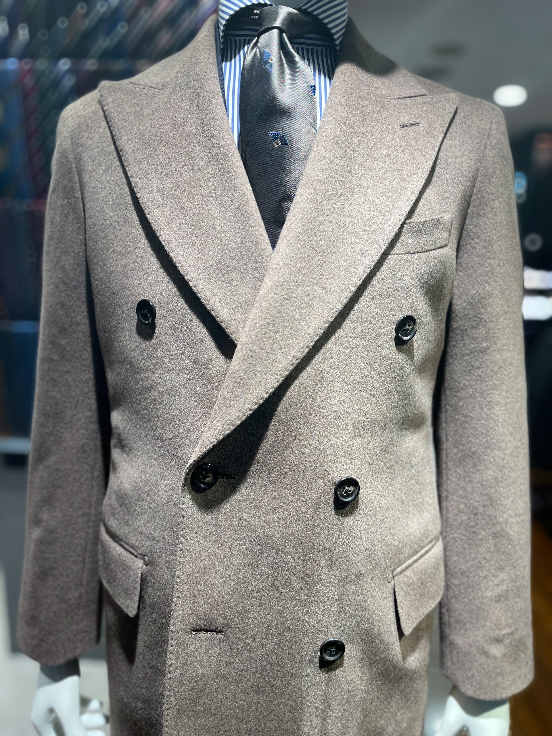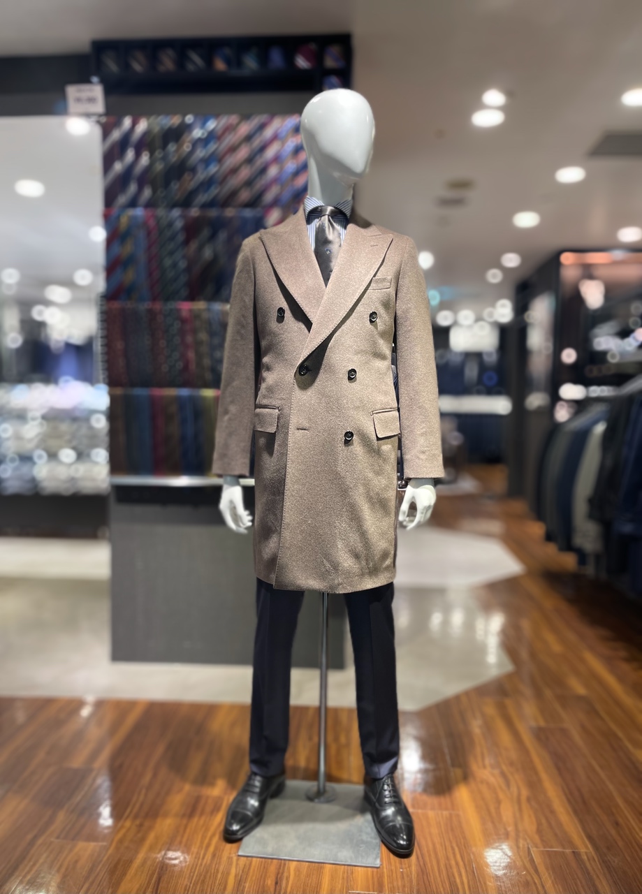 上質感溢れるコートはスーツやジャケットはもちろんですが、ニットの上にさらっと羽織るだけでも様になります。カシミアの独特な光沢感と相まって高級感が漂います。