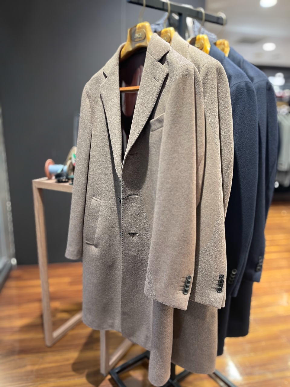 カシミヤ素材を使ったチェスターコート。肌触りのよさや保温性の高さ、上品な光沢感が魅力です。