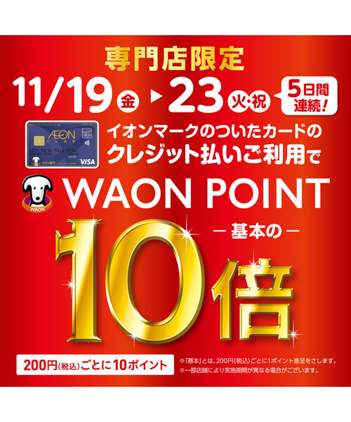 ※イオンマークのついたカードのクレジット払いご利用で、期間中は200円(税込)ごとに10ポイント進呈いたします。