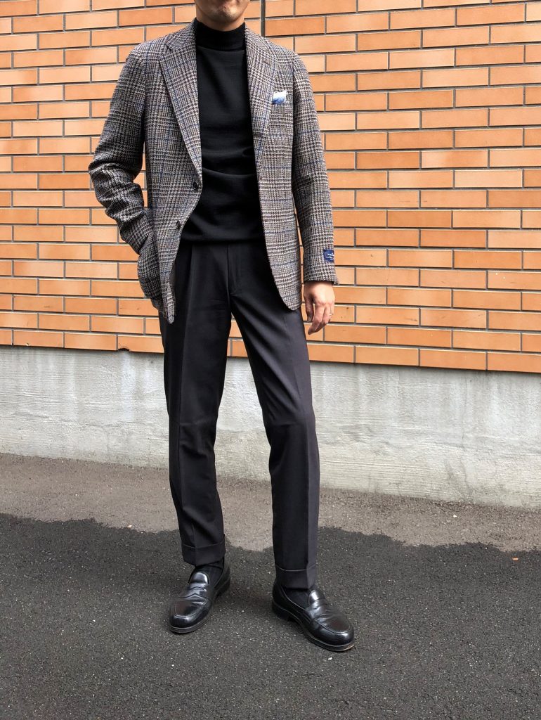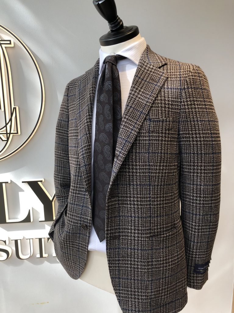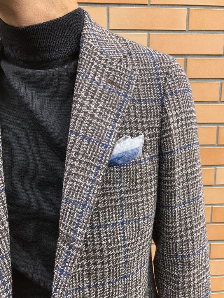 ブラウンのグレンチェックにオーバーペンの柄を重ね合わせた渋みのあるジャケットです。