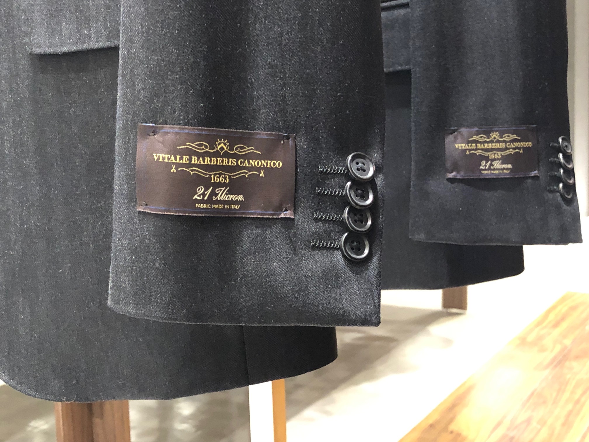 仕立て映えする生地であり、チャコールグレーのヘリンボーン織りと相まって、都会的で凛々しい佇まいです。