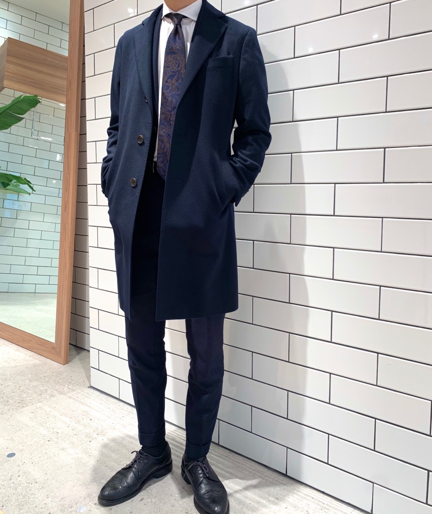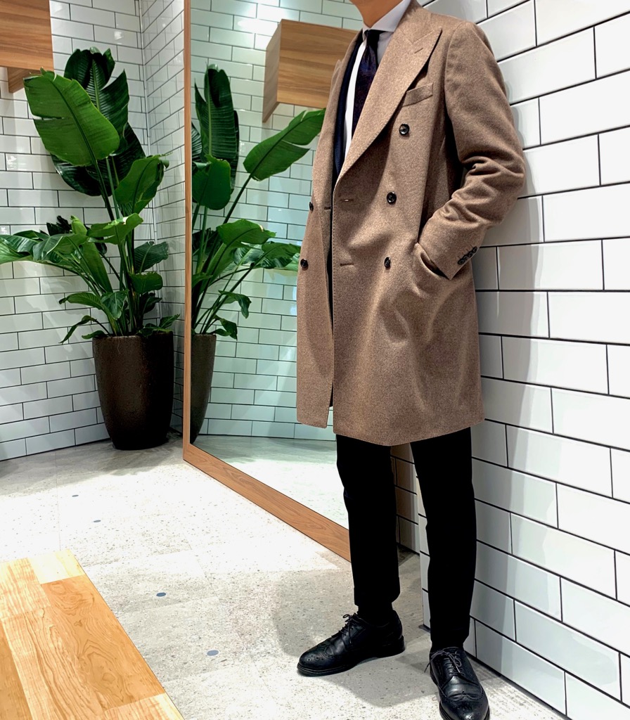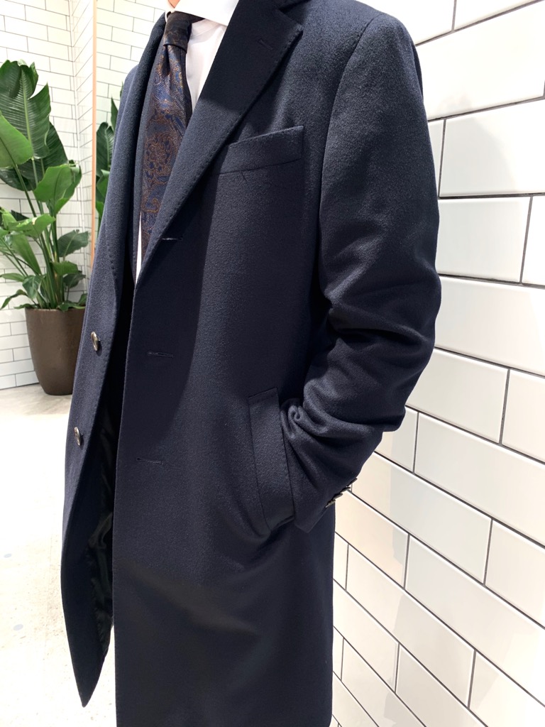 こちらのカシミヤシリーズのコートはスーツ工場で仕立てており、肩回りの副資材を省くことで肩のフィット感を高め、カシミヤの軽さを一層引き立てる着心地に仕上がっています!