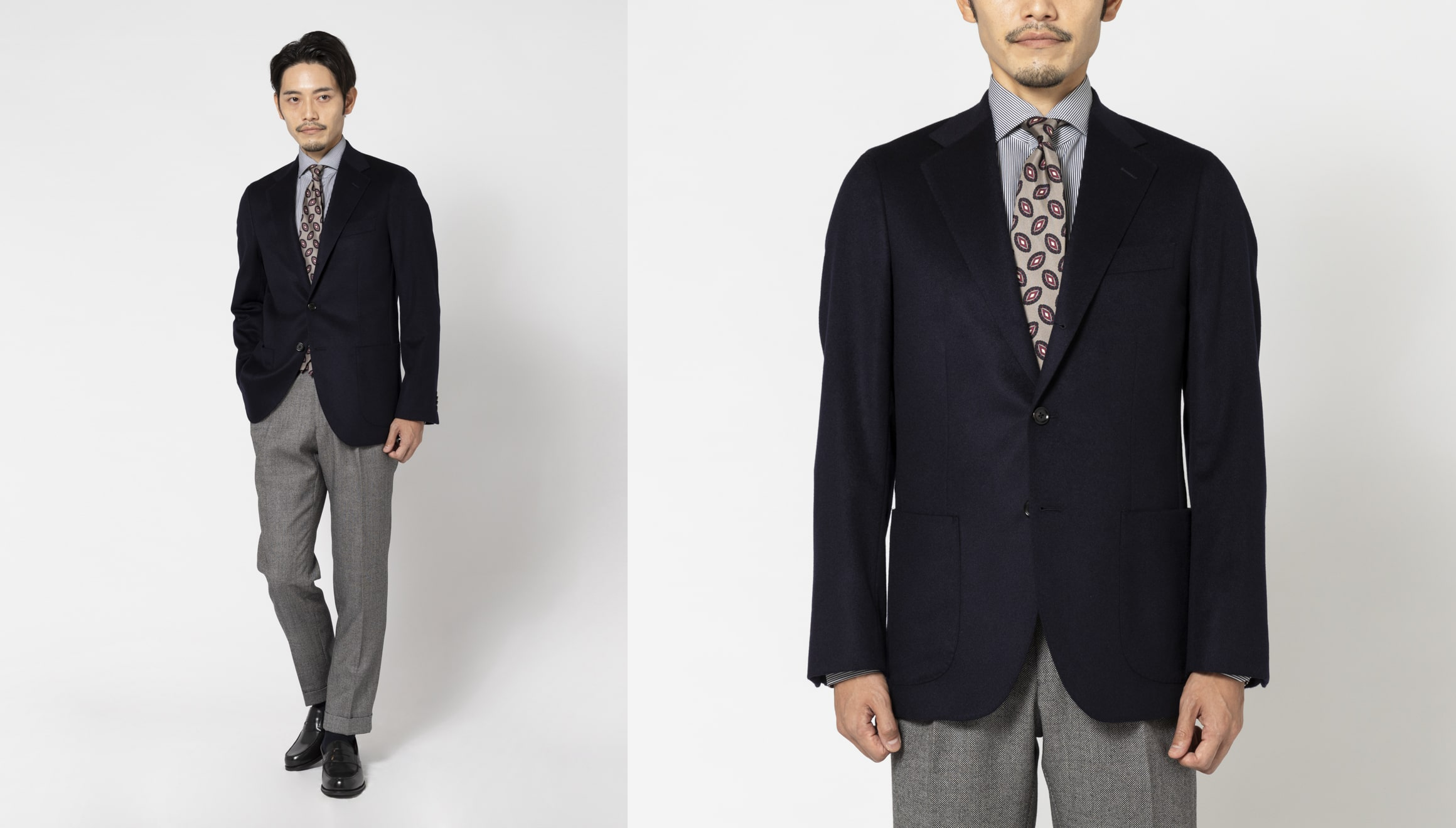 今回詳細するアイテムは「カシミヤ100%」と贅沢な素材を使用、仕立てもスーツ工場で行いあらゆる点で抜かりのないこだわりのアイテムは満足度もケタ違いです。