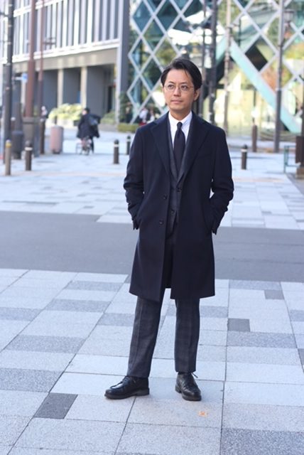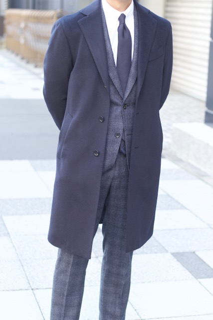 おすすめコート①「カシミヤ100%・ネイビーのチェスターコート」¥74,800(税込)