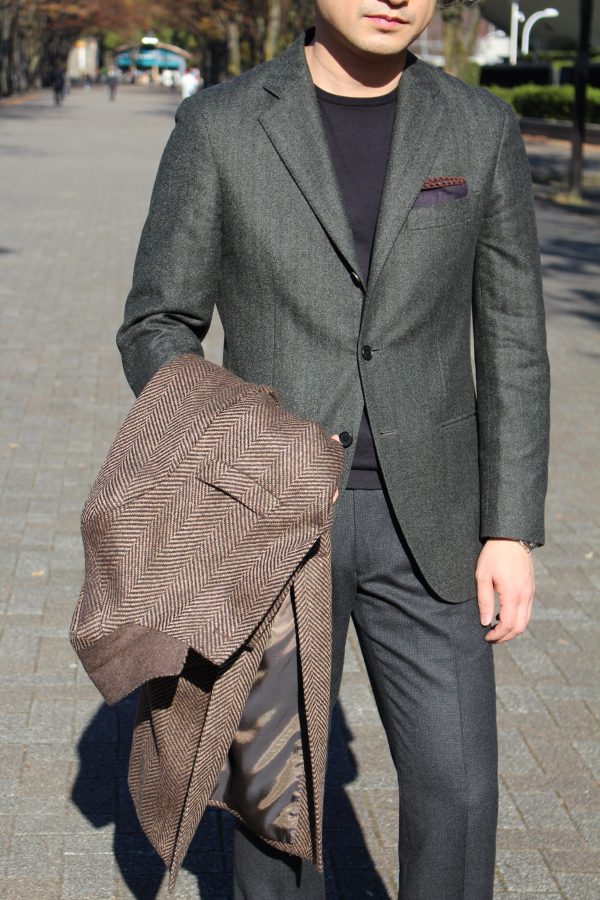 ヘリンボーン柄のベージュカラーは、スーツスタイルでコーディネートしやすく洒落感がとても印象的です。