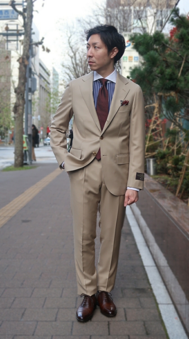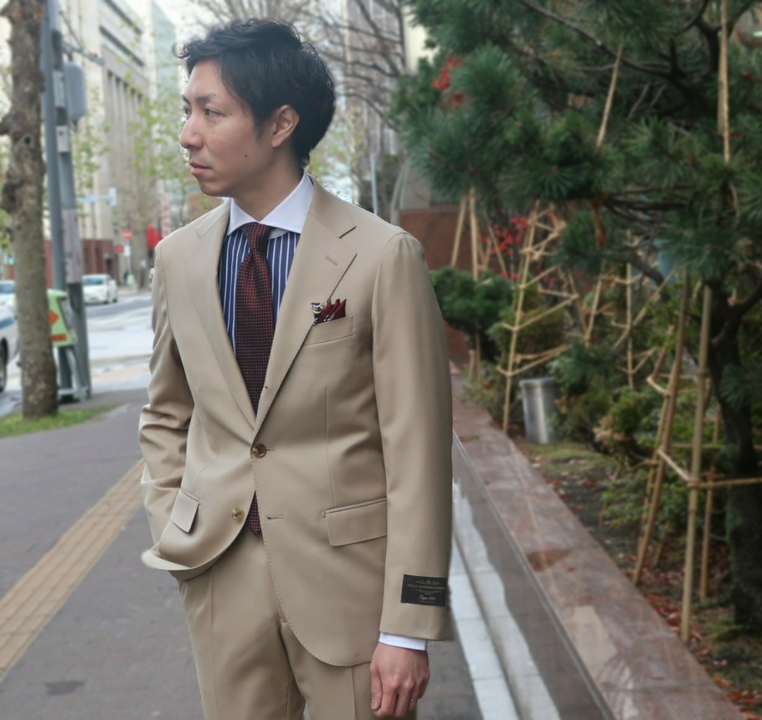ブルースーツと相性抜群のベージュタイで先程のベージュスーツと対照的に