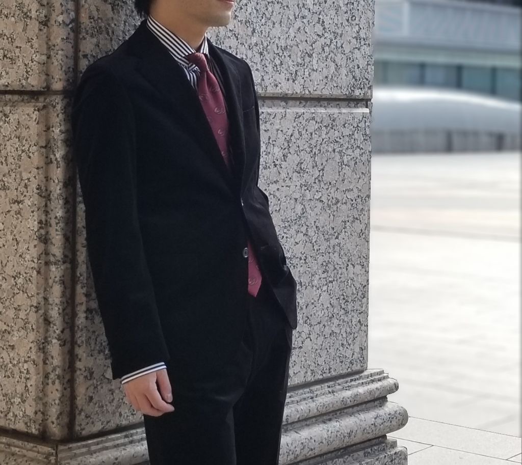カジュアルな印象印象が強いコーデュロイもビジネススーツの型紙を使用することで美しい印象になります、こちらも先程のブラック同様光沢に特徴があり、高級感漂います😍😍