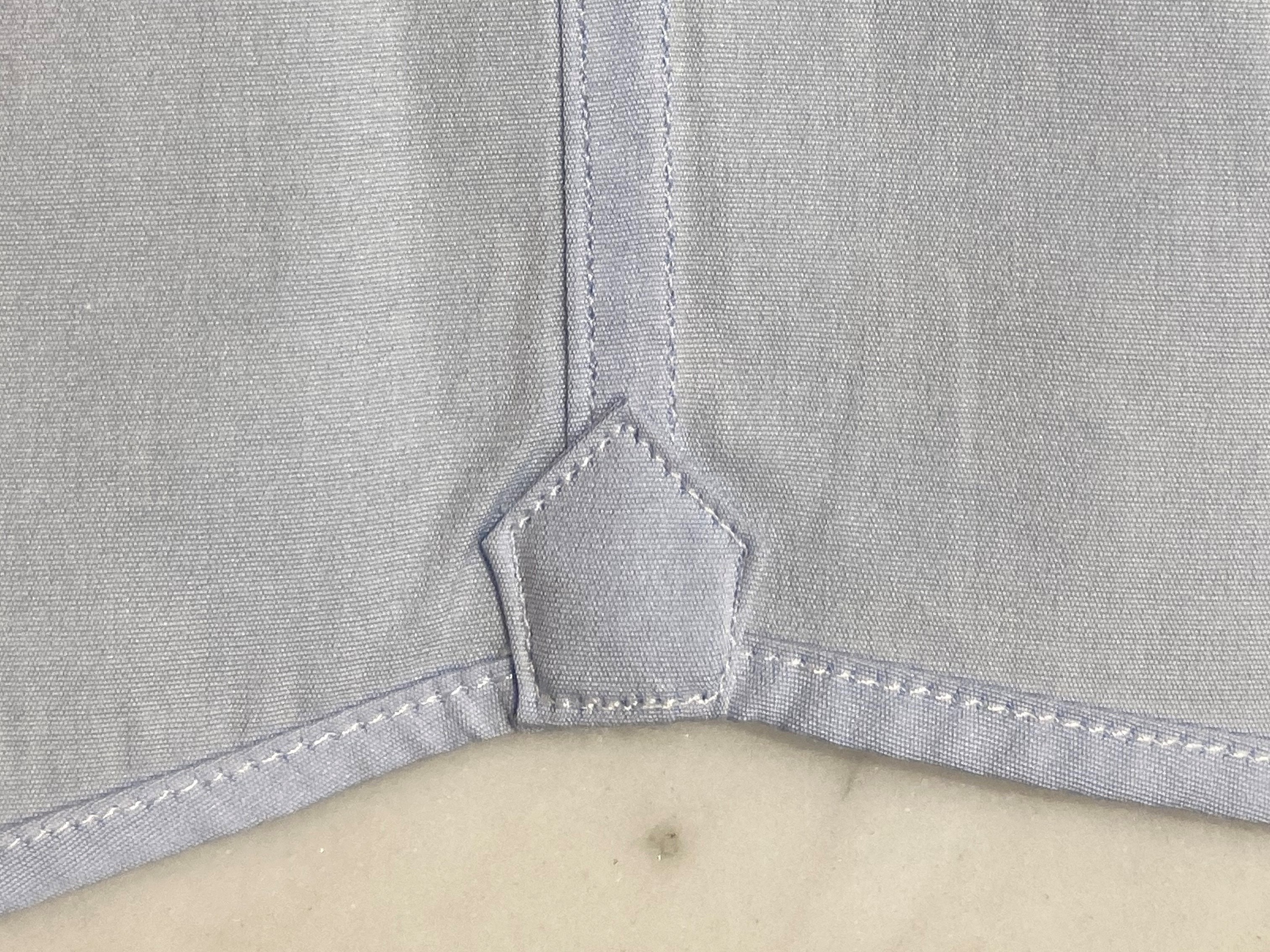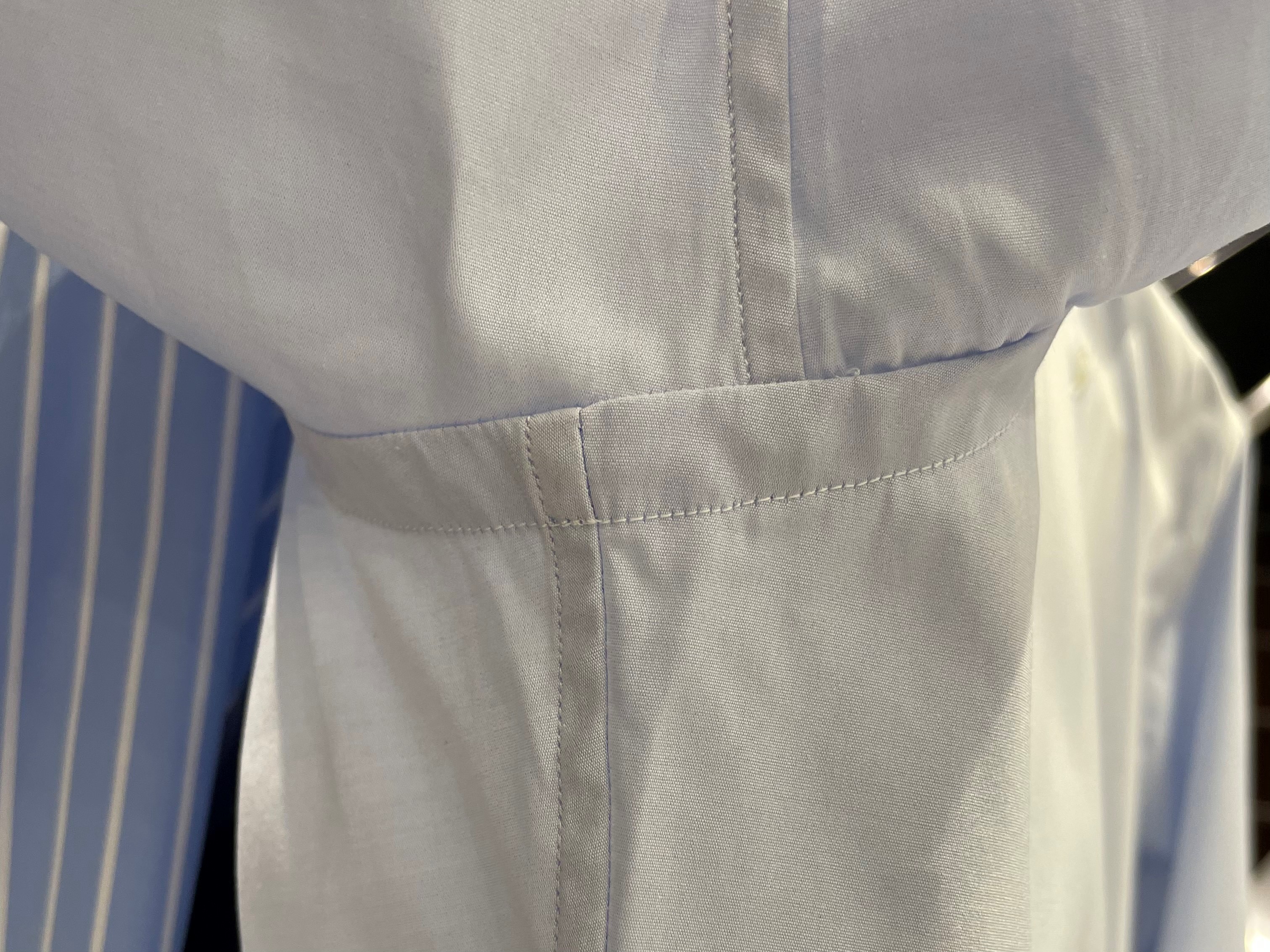 細部のディテール・・・背中心で割られたスプリットヨーク、すっきと見せる背中のダーツ、脇裾にはガゼットと呼ばれる補強布を付けています。