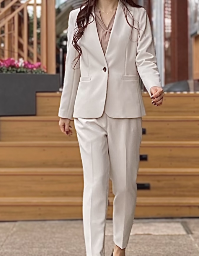 毎シーズン人気の高いノーカラージャケット&テーパードパンツのセットアップです。ジャケットは柔らかな生地感やコンパクトなシルエットから女性らしさは残しつつ、ジャケットのフロントダーツや水平な腰ポケット等細部にはマニッシュな雰囲気を醸し出したデザインです。また、とても軽い着心地でストレッチ性にも優れています。