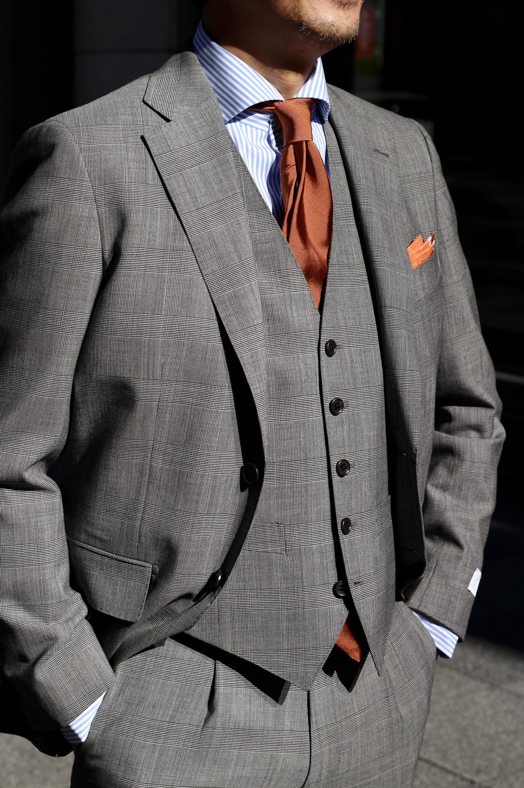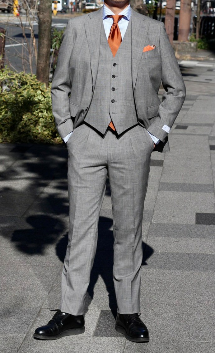 ②グレンチェックの3ピーススーツに、ブルー×オレンジで爽やかさと明るさを印象付けた解放感のあるコーディネート。