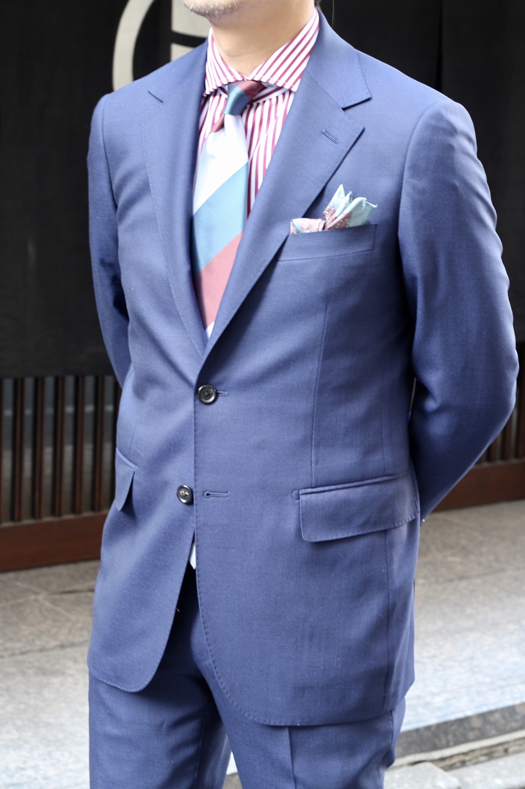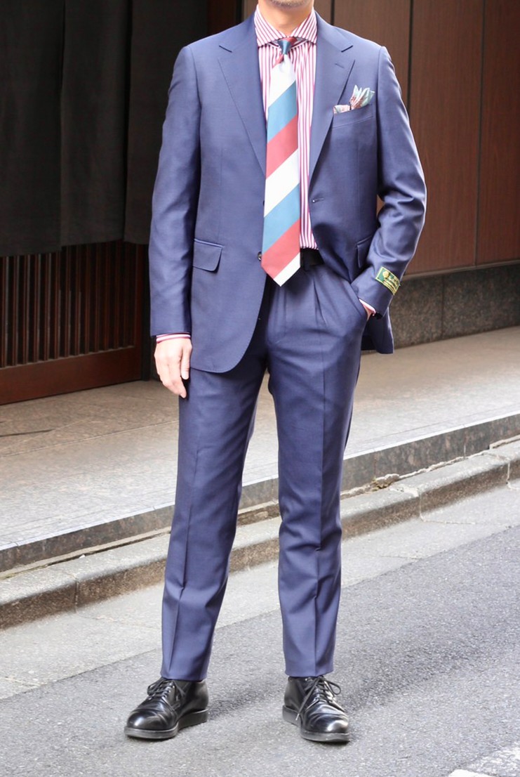①ロイヤルブルーのスーツにレッドストライプをアクセントにした、都会的なコーディネート。