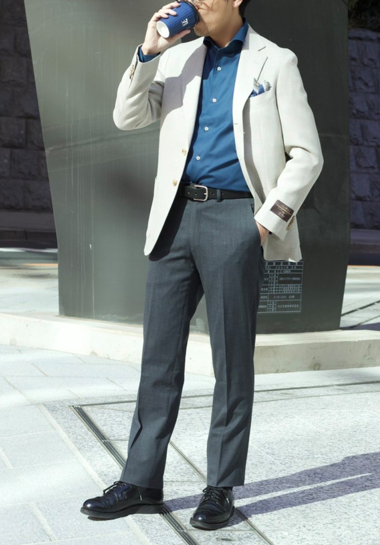 ③ベージュジャケットをアンタイドにして、リラックスさを演出した落ち着きのあるコーディネート。