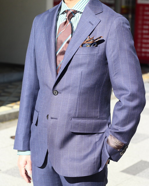 春の新作CANONICOの生地。一見無地に見えるワイドピッチストライプのスーツ。大人のリラックスした印象があります。ブルー×グリーン×ブラウンの3色に、柄は全てストライプの印象が強めのコーディネートです。こだわりポイントは、ストライプのピッチを揃えないこと、やや明るめの色のトーンを合わせたになります。