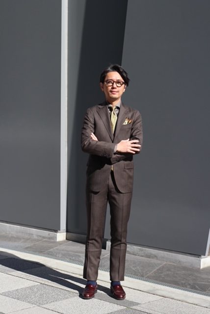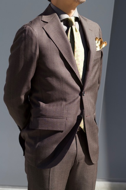 強度と実用性を併せ持つ英国調のブラウンスーツ。着心地は軽快です。ペパーミントグリーンのネクタイを差し色に採り入れた『剛と柔』のコーディネートは、どこか新鮮。スーツ生地はこちらも新作のCANONICO。春先の装いは、シック&ピースで、気分をリフレッシュ♬